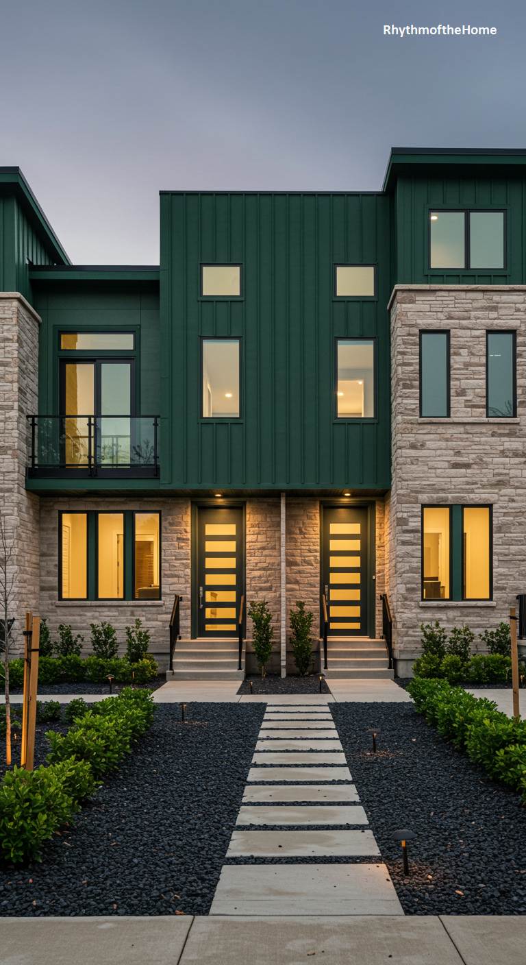 This duplex modern home makes a powerful statement of contemporary urban design through its bold symmetry and sophisticated material palette. The façade is a compelling duet of textures, pairing the rustic, layered appeal of light-hued stone with the sharp, industrial lines of dark green vertical metal siding. Warm light spills from thoughtfully placed windows, offering an inviting glimpse into the twin interiors. A central path of clean-lined pavers bisects the dark pebble landscape, leading to two identical entrances and reinforcing the design’s perfect balance, creating an impression of cohesive, high-style living.