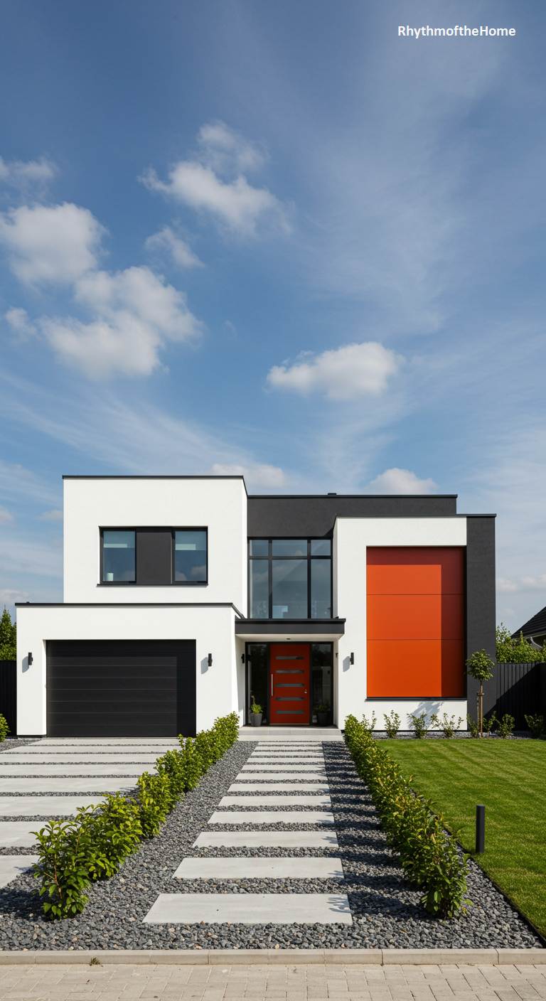 With its crisp lines and daring use of color, this modern home is a masterpiece of contemporary confidence. The structure is a dynamic interplay of interlocking cubic forms, rendered in stark white and deep charcoal to create a powerful graphic statement. A brilliant, fiery orange panel acts as an electrifying focal point, commanding attention and contrasting beautifully with the sleek black garage door. The approach is just as considered, with a disciplined path of pavers set in dark gravel and flanked by neat green hedges, guiding the eye and reinforcing the home’s commitment to clean, purposeful, and visually arresting design.