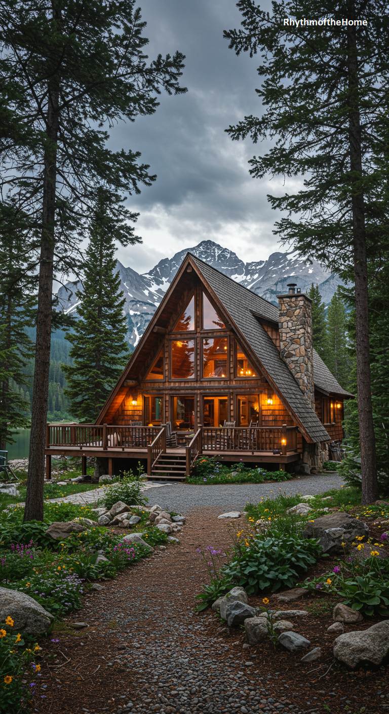 Framed perfectly between two sentinel pines, this classic A-frame mountain home is a beacon of warmth against a dramatic twilight sky. Its grand, glass-paneled facade reveals a glowing interior, promising comfort and sanctuary from the wild. A robust stone chimney stands guard, hinting at a crackling fire within, while the wraparound deck offers a front-row seat to the majesty of the wilderness. The structure rises organically from its woodsy surroundings, with a gravel path winding through wildflowers and rocks, inviting one towards the welcoming light. In the distance, snow-dusted peaks loom under a blanket of moody clouds, completing a picture of perfect, majestic seclusion.