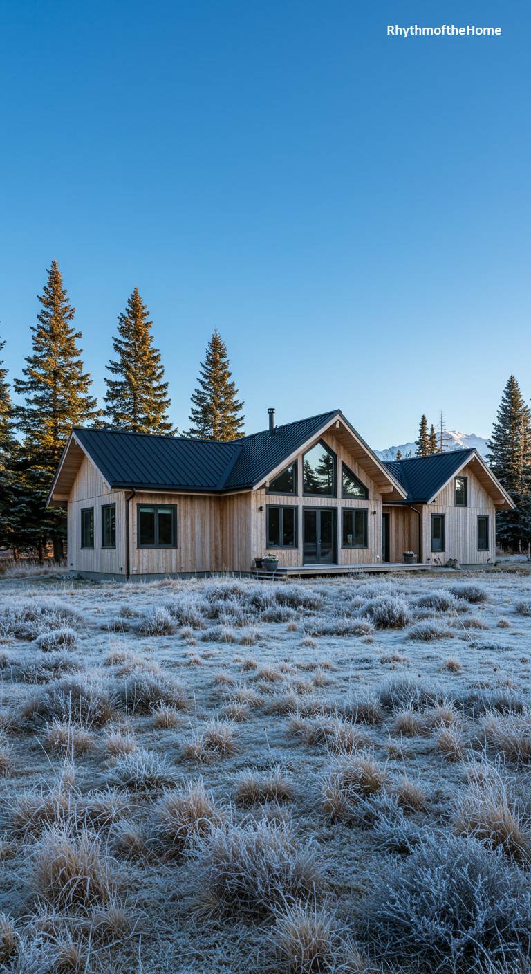 On a crisp, clear morning, this modern cabin sits peacefully in a meadow covered in white frost. The natural, light-wood siding of the home harmonizes beautifully with the pale, frosted grasses. The simple, clean lines of the structure and its dark metal roof provide a contemporary silhouette against the brilliant blue sky and the distant, sun-touched peaks. A row of tall, golden-leaved evergreens stands behind the house, adding a touch of color to the cool-toned landscape. This is a picture of serene, quiet beauty and a fresh start to a day in the mountains.