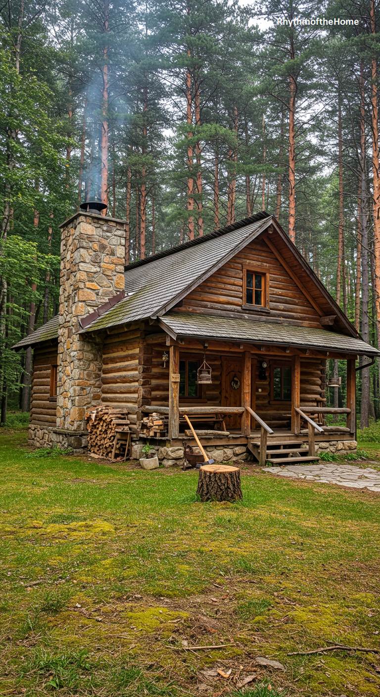 Deep within a tranquil forest of towering pines, this quintessential log cabin stands as a testament to a simpler way of life. Smoke curls lazily from its massive fieldstone chimney, a clear invitation of the warmth held within its solid log walls. A neat stack of firewood rests against the chimney base, ready for the next cold evening. An axe sits atop a chopping block, a rustic detail that speaks of self-reliance and a hands-on connection to the land. The mossy ground and the quiet stillness of the woods create an atmosphere of profound peace, making this the perfect woodsman’s retreat.