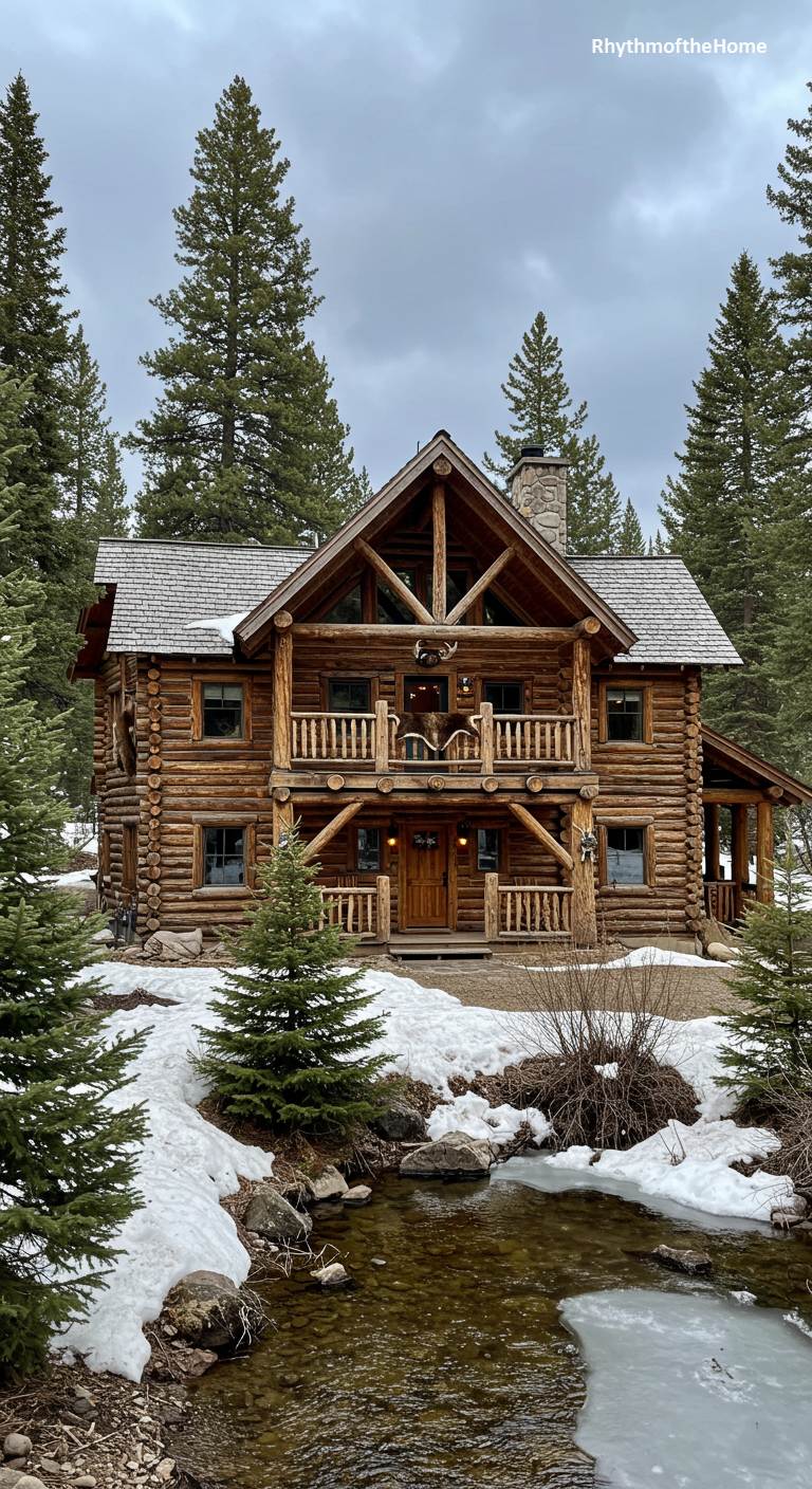 This magnificent two-story log mountain home is a picture of rustic grandeur in a winter wonderland. Built with massive, full-round logs, it boasts a prominent upper balcony perfect for surveying the pristine landscape. Antler decorations on the facade add to its authentic wilderness character. The house is nestled amongst evergreen trees, their branches heavy with snow. A gentle creek flows in the foreground, its dark water a stark contrast to the icy banks and patches of snow, its murmur the only sound in the quiet air. This is a powerful, peaceful scene, capturing the rugged beauty of mountain living in winter.