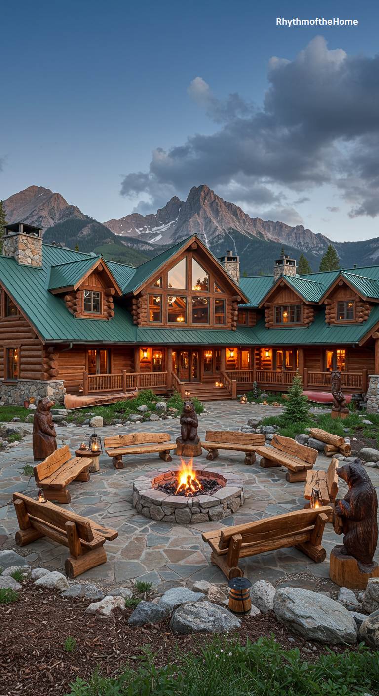 As twilight paints the sky in soft hues, this sprawling log lodge becomes a hub of communal warmth and breathtaking views. A large, circular stone fire pit forms the heart of a grand flagstone courtyard, surrounded by rustic wooden benches that invite storytelling and stargazing. Carved wooden bears stand as whimsical guardians, adding a touch of local artistry. The lodge itself, with its vibrant green roof and glowing windows, radiates hospitality. In the background, the jagged, snow-capped peaks of the Sawtooth Mountains catch the last light of day, providing a truly epic backdrop for this unforgettable mountain home.