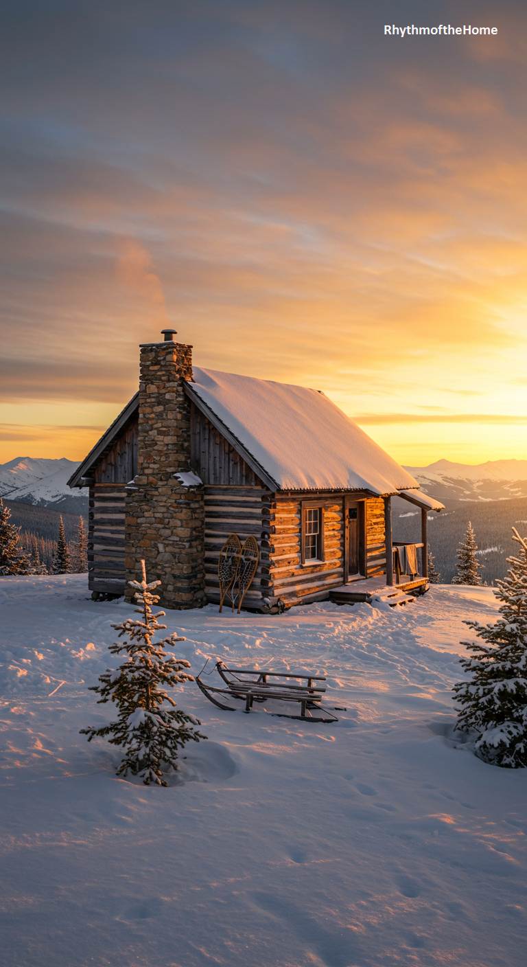 In a vast expanse of pristine, untouched snow, this humble log cabin stands in glorious isolation. The setting sun bathes the entire scene in a warm, golden-orange glow, creating long shadows and making the snow sparkle. Smoke whispers from the stone chimney, a solitary sign of life and warmth in the immense, quiet landscape. A pair of vintage snowshoes leans against the wall, with a wooden sled resting nearby, tools of a life lived in harmony with the harsh beauty of a mountain winter. This is a portrait of solitude, peace, and the profound beauty of a sunset at the top of the world.