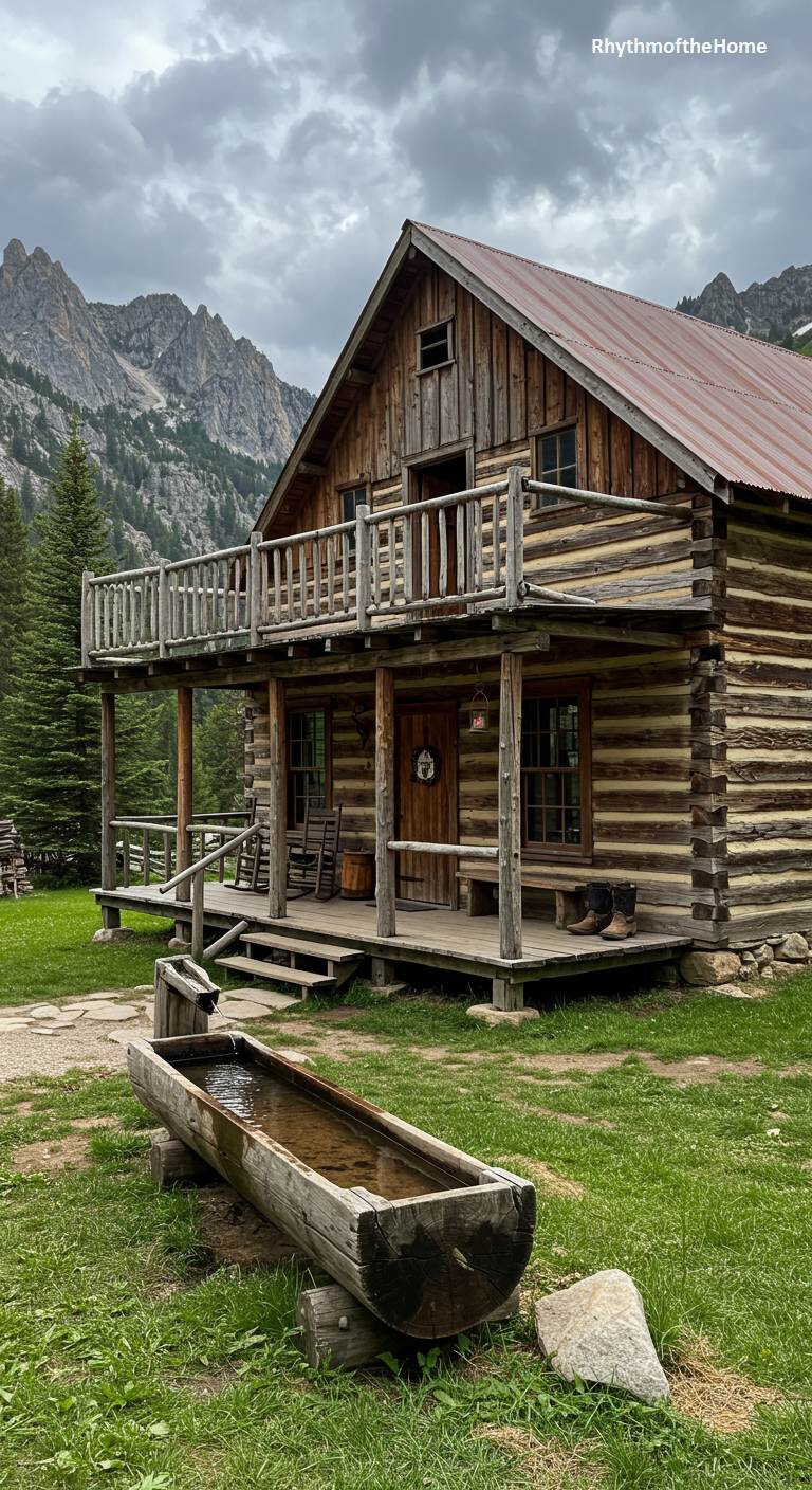 This rustic, two-story log cabin feels like a preserved piece of the pioneer spirit, nestled at the foot of dramatic, jagged mountains. Its weathered, unpainted logs and simple wooden balcony speak of function over fuss, built to withstand the elements. Rocking chairs on the porch invite a moment of rest after a long day’s work. In the foreground, a hollowed-out log serves as a water trough, a charming and practical feature that enhances its authentic, historical feel. Surrounded by green grass and tall pines, this mountain home is a nostalgic glimpse into a rugged, self-sufficient past.