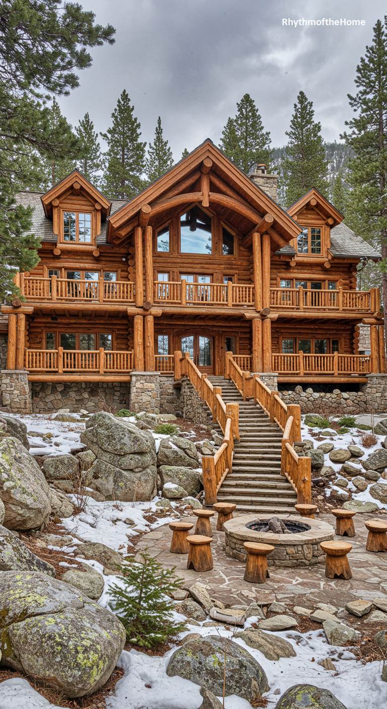 This monumental log home is an architectural marvel of wood and stone, designed on a truly grand scale. Three stories of massive, honey-toned logs are anchored to a foundation of colossal river-stone boulders. A magnificent wooden staircase cascades down to a lower patio, where a stone fire pit surrounded by log stools awaits. The sheer size and complexity of the structure, with its multiple balconies and expansive windows, are breathtaking. Patches of snow on the ground hint at the changing seasons, but the home itself stands as an enduring, powerful fortress of luxury and comfort amidst the tall pines.