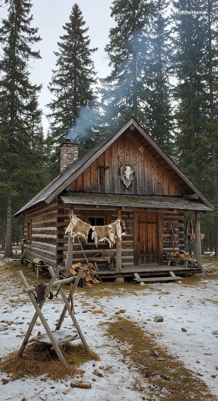 Steeped in the lore of the wilderness, this rustic log cabin appears as a trapper’s outpost from a bygone era. A magnificent moose skull and antlers are mounted prominently on the gable, a tribute to the wild spirit of the place. Animal pelts are stretched out to cure on the porch and a drying rack, speaking to a life of hunting and self-reliance. Smoke drifts from the stone chimney, a comforting sign in the chilly, sparsely-snowed landscape. Surrounded by a forest of dark spruce trees, this cabin is not just a dwelling but a story of survival and respect for the natural world.