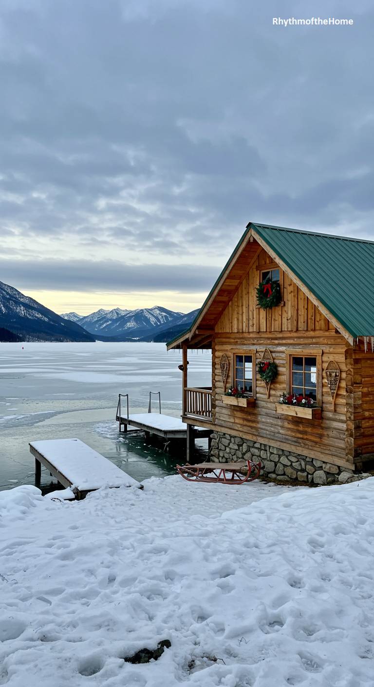 This cozy log cabin sits right at the edge of a vast, frozen lake, offering a scene of serene winter beauty. Its honey-colored logs and green metal roof are cheerfully decorated with Christmas wreaths, adding a festive touch to the tranquil landscape. A small wooden dock extends out over the ice, with another path cleared across the snow-covered pier. A vintage wooden sled rests against the stone foundation, and a pair of old-fashioned snowshoes hangs by the door, completing the picture of classic winter recreation. The cloudy sky and distant, hazy mountains create a peaceful, almost silent atmosphere.