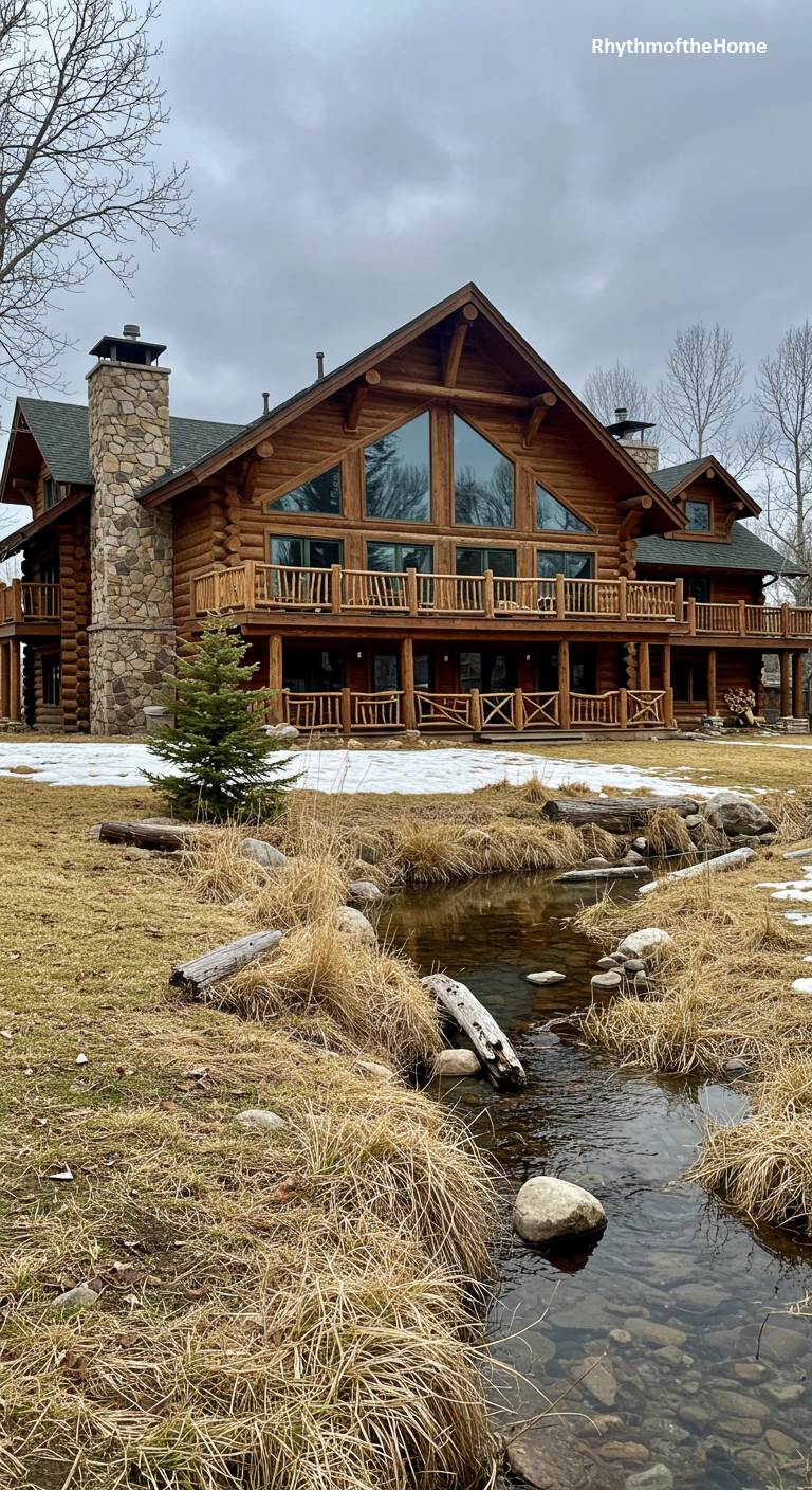 This expansive log mountain home, a veritable mansion of timber and stone, exudes rustic luxury. Its large A-frame window section provides panoramic views of the surrounding landscape. A wide, wraparound deck offers ample space for outdoor living and enjoying the crisp air. In the foreground, a clear stream meanders through dormant winter grasses, its gentle flow adding life to the scene. Patches of snow dot the lawn, signaling the transition between late autumn and early winter. The home feels both imposing in its scale and perfectly integrated into its natural, waterside setting under a dramatic, cloudy sky.