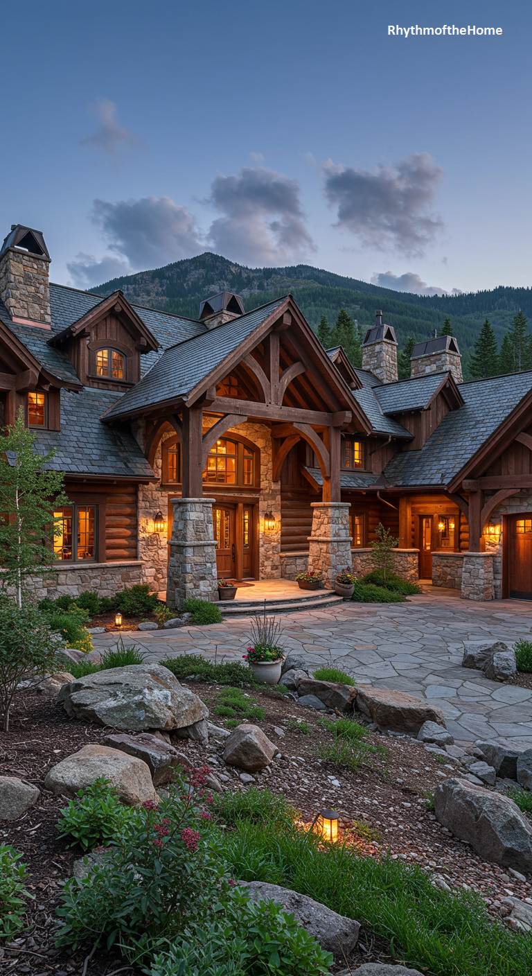 This is not merely a house; it is a grand mountain lodge, a testament to rustic opulence. Massive timber-frame arches and stout stone pillars create an entryway of formidable presence, suggesting a legacy of warmth and hospitality. The complex roofline, with its multiple gables and dormers, speaks to a sprawling interior designed for gathering. As dusk settles, warm light spills from every window, illuminating the rich textures of the log walls and the smooth flagstone of the courtyard. Nestled against a backdrop of rolling, forested hills, this home is a masterpiece of craftsmanship, blending seamlessly into its ruggedly beautiful environment.