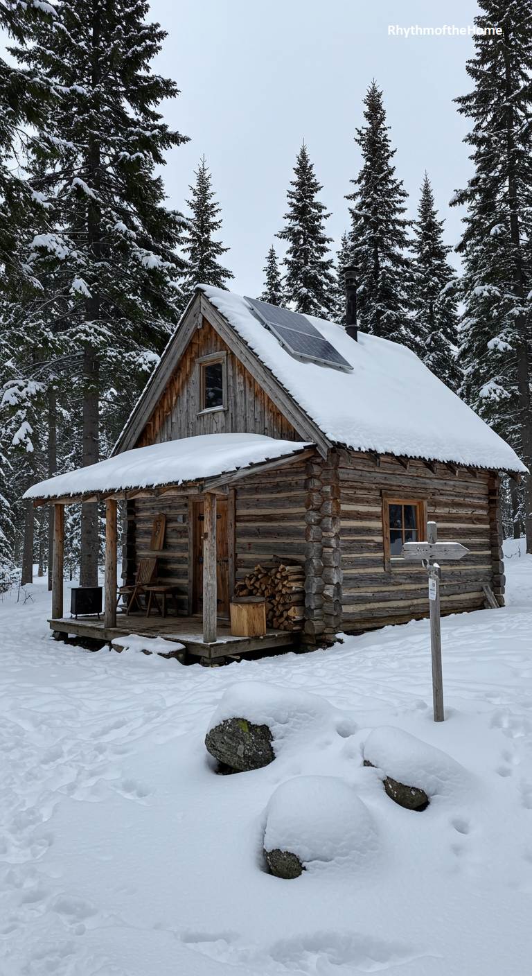 Tucked away in a deep, snowy forest of Finnish pines, this humble log cabin is the epitome of off-grid simplicity and peace. A thick blanket of fresh snow covers the roof and the ground, muffling all sound and creating a sense of profound quiet. A single solar panel on the roof is a subtle nod to modern self-sufficiency, providing power in this remote location. Firewood is stacked neatly on the covered porch, a necessity for warmth. A wooden signpost points the way, suggesting this hidden gem is part of a larger network of trails. This is a true escape, a place for quiet contemplation.