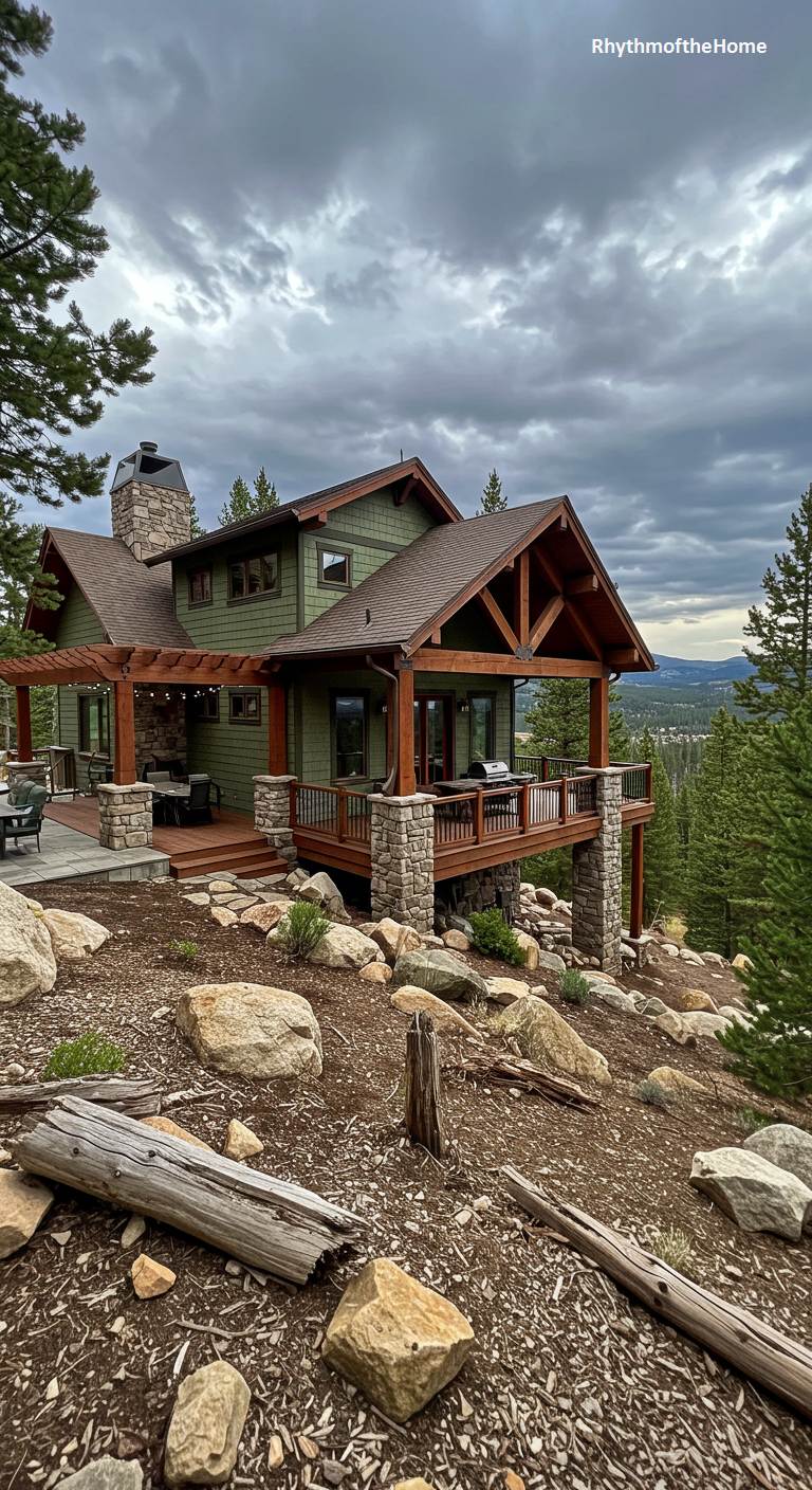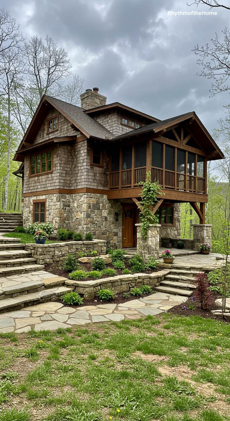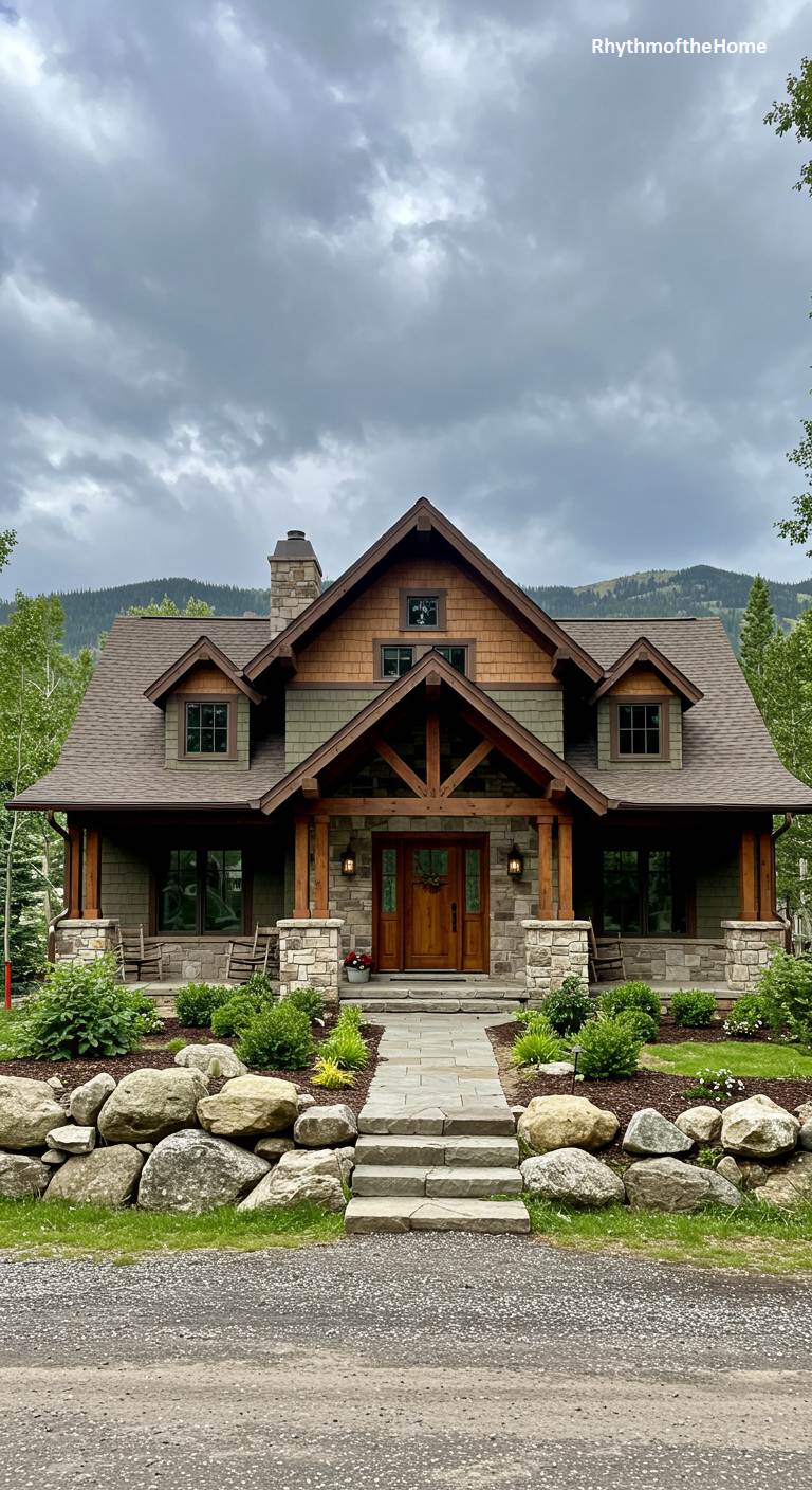 This charming Craftsman-style mountain home presents a perfectly symmetrical and inviting facade. Its sage-green siding is beautifully complemented by rich wood accents in the porch columns and gabled truss, all resting on a foundation of warm-toned fieldstone. A flagstone path leads up a set of gentle steps to the handsome wooden front door. The landscaping is immaculate, with large boulders and lush shrubbery creating a natural yet manicured look. Set against a backdrop of forested hills under a cloudy sky, this home radiates a feeling of stability, comfort, and timeless architectural appeal.