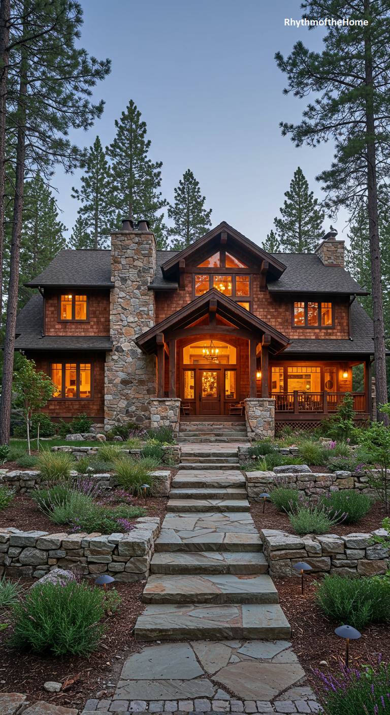 As dusk descends, this magnificent woodland mountain home transforms into an enchanted lodge. A long, elegant flagstone staircase winds up through tiered gardens, beautifully lit and planted with lavender and other perennials, guiding the way to the welcoming entrance. The home itself is a masterpiece of rustic design, combining wood shingles, heavy timber framing, and robust stone chimneys. The warm, golden light emanating from the windows creates a magical, inviting glow against the deepening blue of the evening sky and the dark silhouette of the surrounding pine forest. It feels like a luxurious sanctuary hidden deep within the woods.