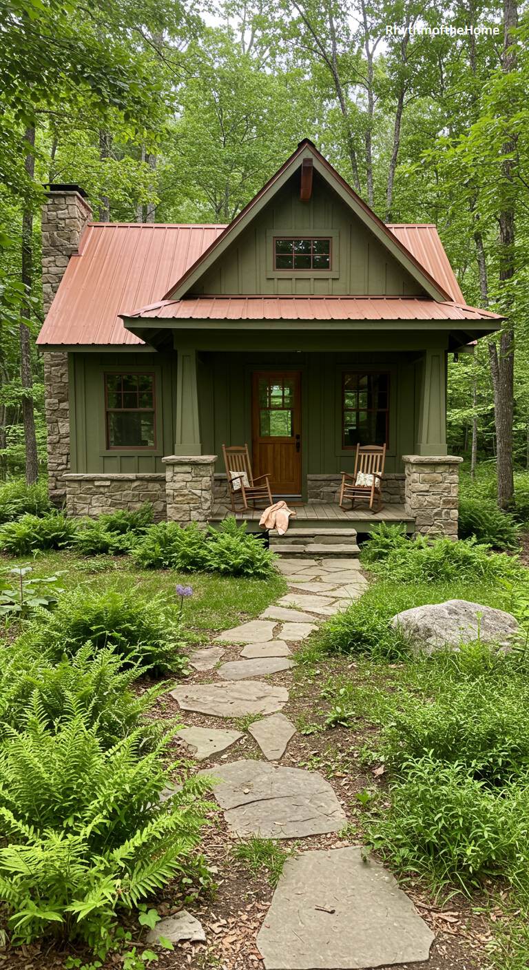 This small mountain home is a jewel of cozy design, nestled in a lush, verdant forest. Its olive-green vertical siding and rust-colored metal roof blend perfectly with the natural surroundings. A simple porch with two rocking chairs offers a tranquil spot to enjoy the sounds of the woods. The home is enveloped by a sea of vibrant green ferns, giving it the feeling of a secret cottage in a hidden glen. A meandering flagstone path, laid organically through the undergrowth, adds to the whimsical, almost magical charm of this peaceful and utterly delightful woodland retreat.