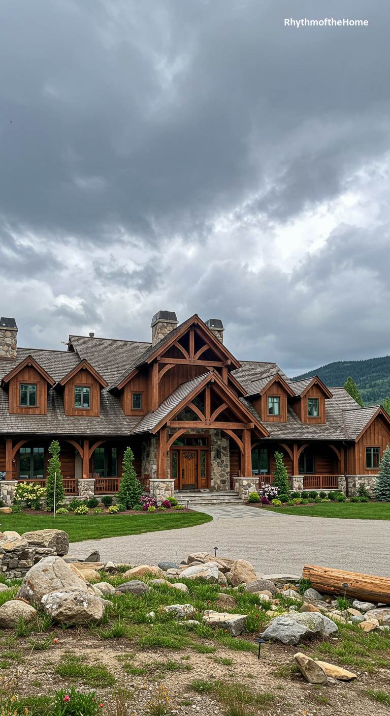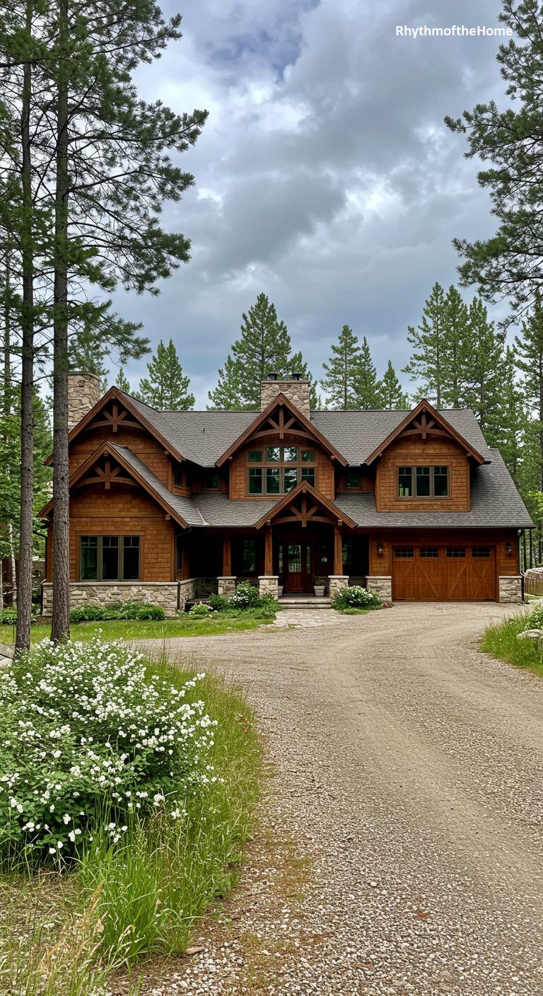 Set back from a gravel driveway and framed by tall pine trees, this large mountain home is the epitome of classic rustic elegance. Its warm, brown wood siding and stone accents blend seamlessly with the forest setting. A prominent, covered front porch and a large garage with handsome wooden doors speak to a design that is both welcoming and practical. A bush of delicate white flowers adds a touch of softness to the foreground. Under a dramatic, cloudy sky, this home projects an aura of quiet strength and comfortable, family-oriented living in the heart of nature.