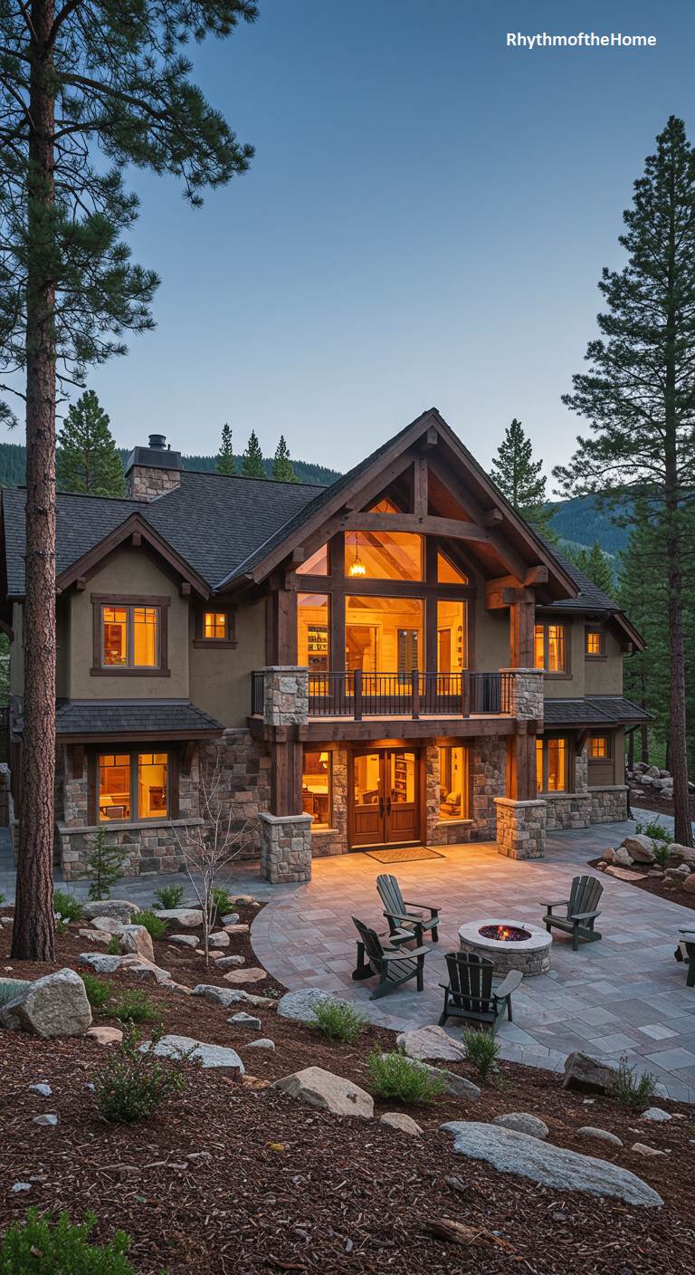 As evening settles over the mountains, this inviting home offers the perfect setting for a cozy night outdoors. A beautiful stone patio surrounds a modern fire pit, with comfortable Adirondack chairs arranged for conversation and warmth. The house itself, a blend of stucco, stone, and heavy timber framing, glows from within. Its large, second-story balcony and expansive windows are designed to capture the beauty of the surrounding landscape. The meticulous landscaping, with its rocky outcrops and native plants, integrates the home beautifully into its sloping, wooded lot, creating a luxurious yet comfortable retreat.
