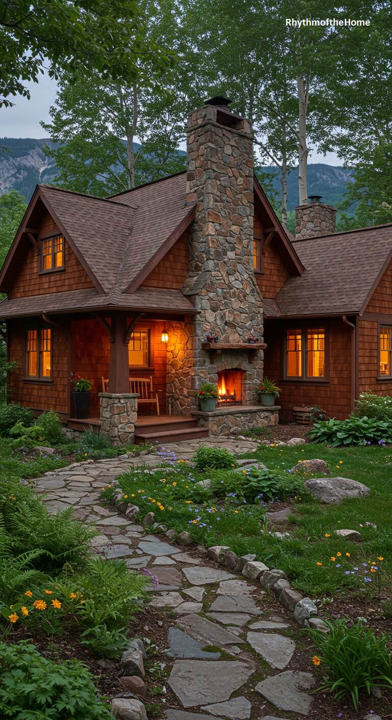 This charming mountain home redefines the concept of a cozy welcome with its unique outdoor fireplace. Built into a magnificent stone chimney on the front porch, the fire creates an immediate beacon of warmth and hospitality. A winding flagstone path meanders through a lush garden filled with wildflowers and ferns, leading guests to this inviting entrance. The home’s rich, brown wood-shingled exterior and warm, glowing windows enhance the feeling of a snug and comfortable sanctuary. Nestled amongst aspen trees with a mountain peeking through in the background, this is the perfect picture of a storybook cottage.