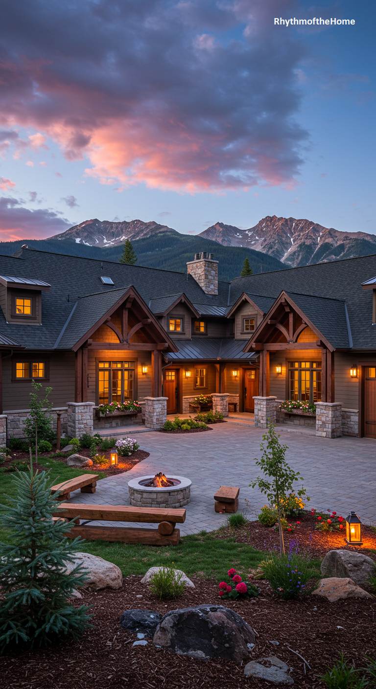 This spectacular mountain home is designed to embrace the panoramic beauty of its setting. As the sun sets, the sky explodes in a dramatic palette of pink, orange, and purple, backlighting the rugged, snow-dusted mountain range. The home itself, a sprawling timber-frame structure, is arranged around a central courtyard. A fire pit flickers at the heart of the patio, while simple wooden benches provide seating. The warm lights from the house and lanterns scattered around the yard create an atmosphere of magical, communal celebration, making it an idyllic place to witness the daily spectacle of nature.
