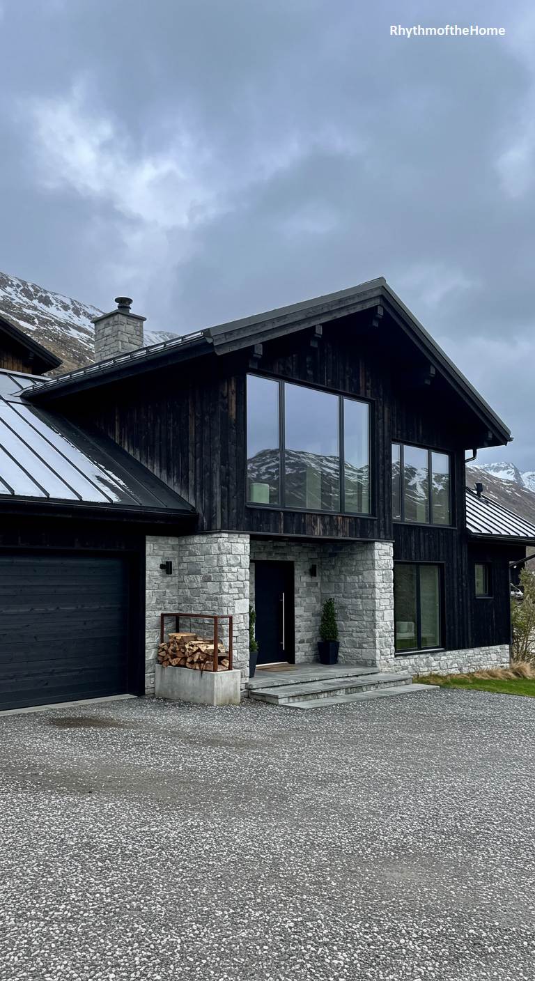 Embracing a stark, minimalist aesthetic, this mountain home is a study in elegant contrasts. The upper level, clad in vertical black timber, appears to float above a solid foundation of light-grey, ashlar stone. Large, unadorned picture windows serve as living canvases, capturing and reflecting the stoic, snow-dusted mountains in the distance. The clean lines and sharp angles of the architecture stand in bold opposition to the organic ruggedness of the landscape. A neatly stacked pile of firewood provides a touch of rustic warmth, a promise of comfort within this cool, contemporary, and utterly sophisticated alpine retreat under an overcast sky.