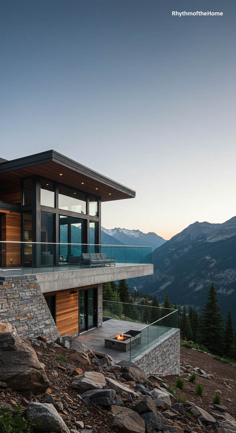 This stunning example of modern architecture is a statement of sleek sophistication set against a wild, untamed mountain landscape. Clean lines, a flat roof, and a minimalist palette of wood, stone, and concrete define its form. The structure is built into the rocky hillside, with a lower-level patio featuring a fire pit and an upper-level balcony enclosed by seamless glass railings. These expansive glass walls not only offer uninterrupted, panoramic views of the distant peaks at dusk but also reflect the clear, open sky. This is a luxurious, cutting-edge retreat for those who appreciate both high design and high altitudes.