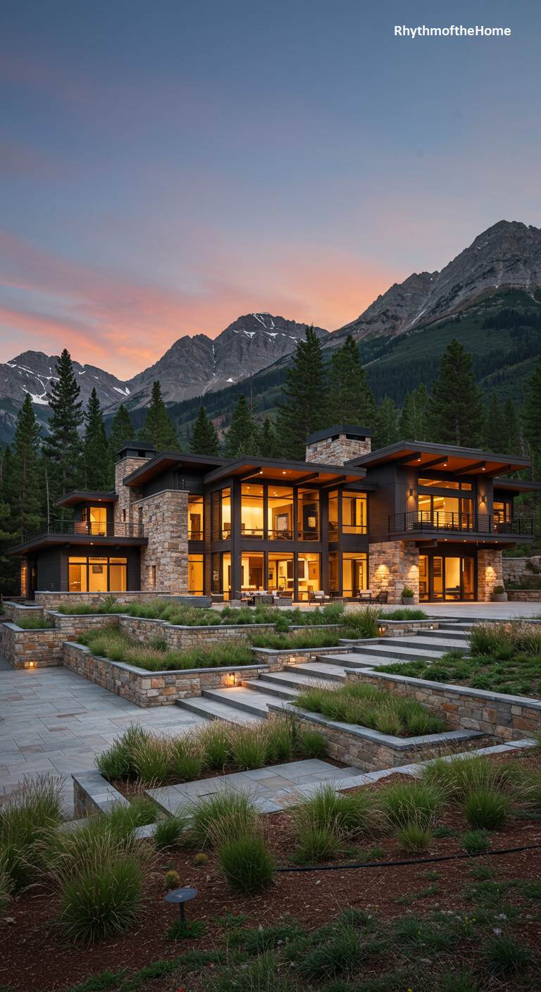 At twilight, this magnificent modern mountain home becomes a symphony of light, structure, and nature. Its multi-level design features clean, horizontal lines that echo the layered landscape. Warm light pours from floor-to-ceiling windows, illuminating the beautiful stone and wood exterior. The landscaping is a masterpiece of modern design, with tiered stone planters filled with ornamental grasses creating a series of elegant terraces that cascade down the property. Set against a backdrop of dramatic, jagged mountains under a softly colored sky, this home represents the pinnacle of contemporary alpine luxury and architectural artistry.