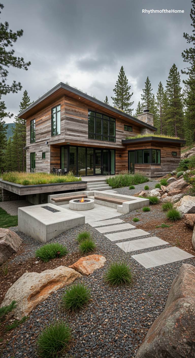 This modern home is a beautiful fusion of sustainable design and rustic materials. The exterior is clad in reclaimed wood, giving it a weathered, textural quality that complements the surrounding pine forest. A living roof, covered in lush green grasses, helps the structure merge with its environment. Concrete forms the foundation and creates a clean, minimalist patio area with a built-in fire pit and benches. Large windows and a thoughtful layout ensure a constant connection to the outdoors, making this a perfect example of how contemporary design can be both stylish and deeply respectful of its natural setting.