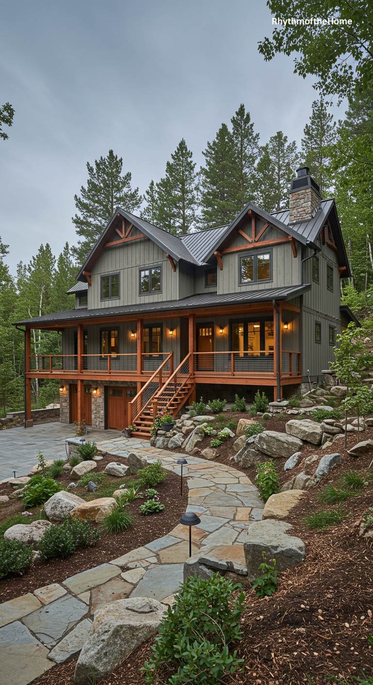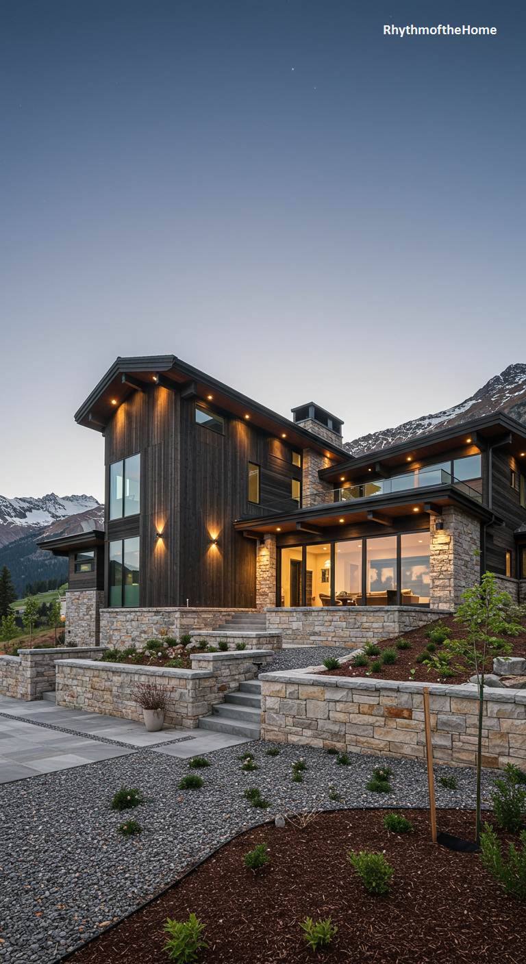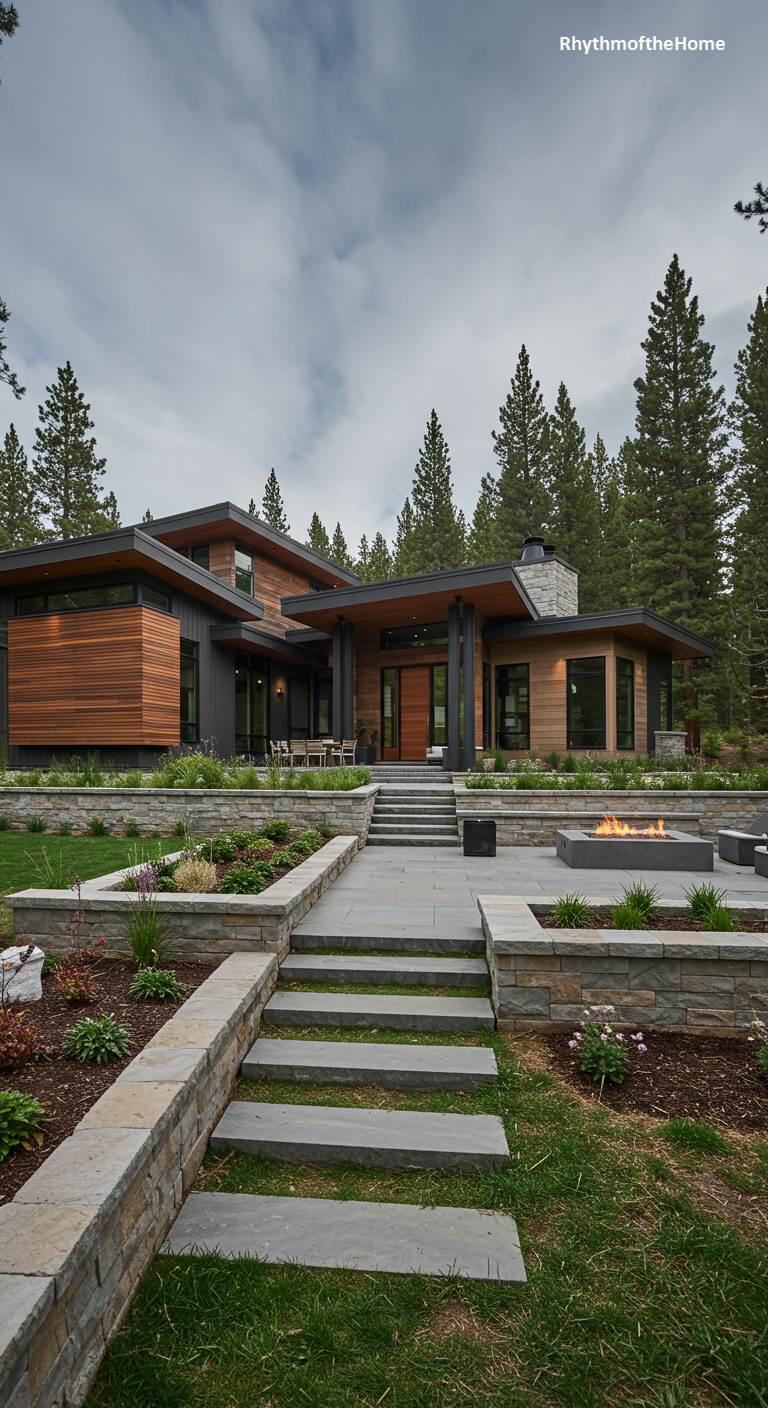 This contemporary mountain home is a beautiful composition of clean lines, natural materials, and thoughtful landscaping. A series of wide, floating stone steps ascends through a tiered garden, leading to the main entrance. Low stone retaining walls create elegant planting beds, while a modern fire pit offers a focal point for outdoor gatherings. The home’s architecture is a dynamic mix of wood siding, dark panels, and a prominent stone chimney, all under a series of interesting, angled rooflines. It’s a design that feels both perfectly modern and deeply connected to its wooded, hillside setting.
