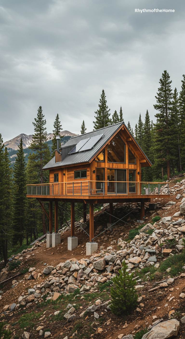 This clever A-frame cabin is ingeniously perched on a steep, rocky hillside, supported by a system of tall stilts and concrete piers. This elevated position not only provides a stable foundation on difficult terrain but also lifts the home into the treetops, offering spectacular, unobstructed views of the surrounding forest and distant, snow-flecked peaks. The natural wood siding and metal roof are practical and stylish, and a full-width deck with a modern cable railing creates an incredible outdoor space. Solar panels on the roof hint at a self-sufficient, eco-friendly lifestyle in this unique and adventurous mountain perch.