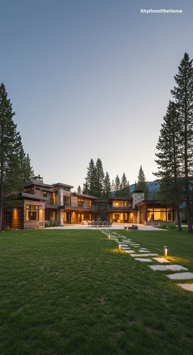 At the edge of a clearing, framed by tall pines, this expansive modern home stretches across the landscape with quiet confidence. A vast, manicured lawn provides a sense of openness and space, leading to a large patio area perfect for entertaining. A stepping-stone path, elegantly lit, cuts a gentle curve across the grass, inviting a leisurely stroll under the twilight sky. The home’s architecture, with its blend of wood, stone, and large windows, is low-slung and integrated, designed to connect its inhabitants with the serene beauty of their private woodland estate. It’s a picture of peaceful, understated luxury.