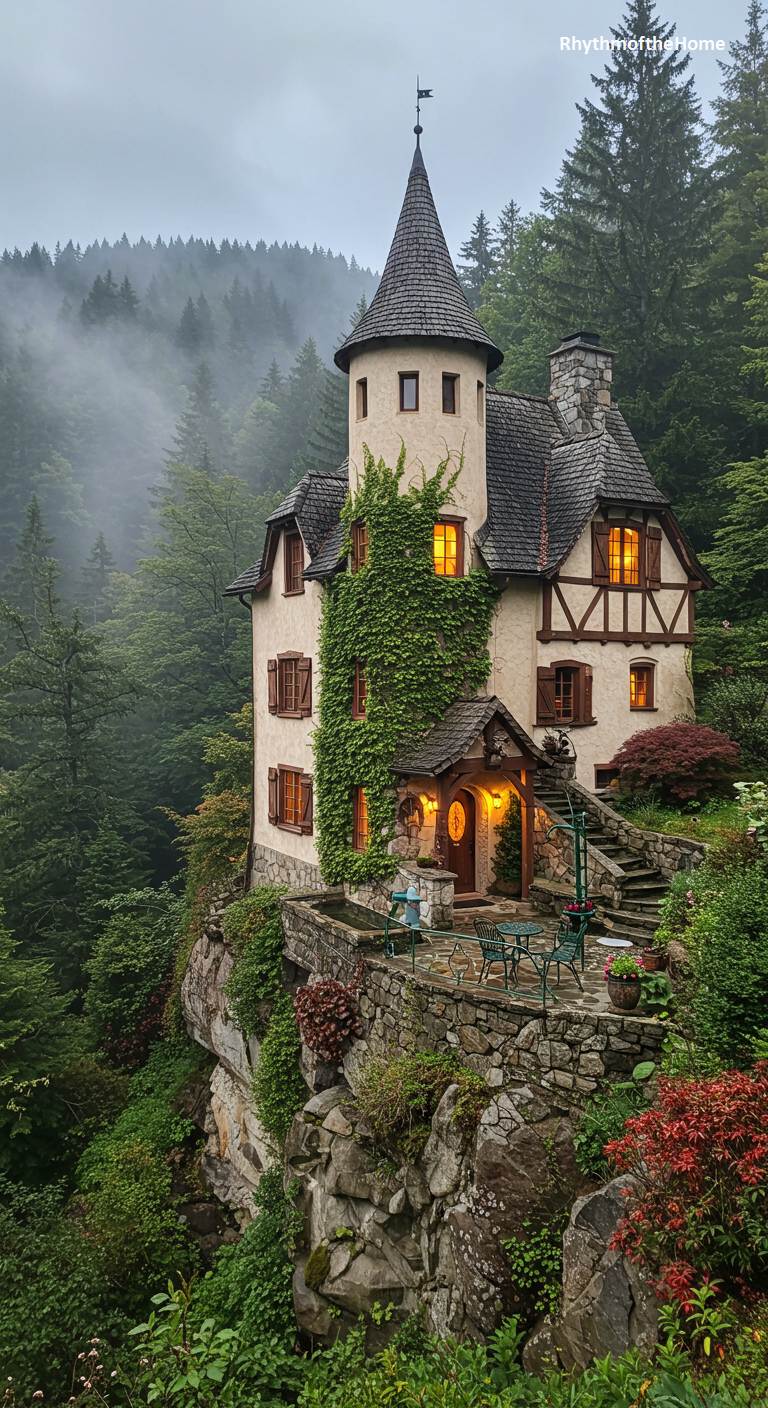 Perched precariously on a rocky cliffside, this enchanting mountain home seems to have been plucked directly from a fairytale. A storybook turret with a conical roof reaches for the misty sky, while ivy climbs the stucco walls, weaving a tapestry of green against the cream-colored facade. Warm light glows from behind wooden shutters, suggesting cozy nooks and ancient stories being told within. A stone terrace, furnished for quiet contemplation, overlooks a deep, fog-filled valley of dense pine forest. This is a place of magic and mystique, a secluded haven where time slows down, lost in the ethereal beauty of the mountains.