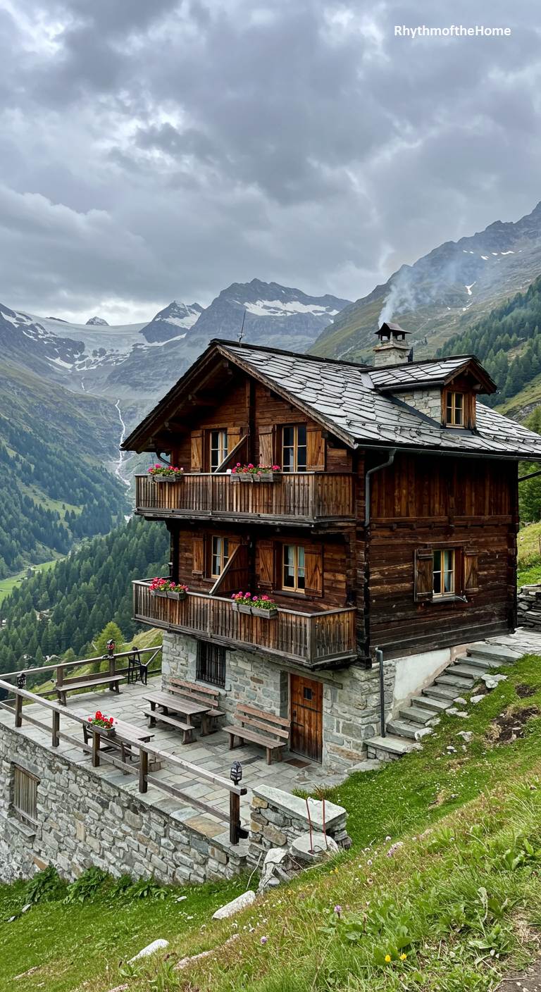 Perched on a lush green slope overlooking a spectacular alpine valley, this traditional Swiss farmhouse is a vision of rustic beauty. Its weathered dark wood, stone foundation, and slate-like roof speak of centuries of enduring the mountain elements. Cheerful pink flowers spill from window boxes on the wooden balconies, adding a splash of vibrant color. A stone terrace with simple wooden tables and benches offers an unparalleled spot to take in the view of distant glaciers and waterfalls. Smoke drifting from the chimney completes this idyllic picture of life in the heart of the Swiss Alps.