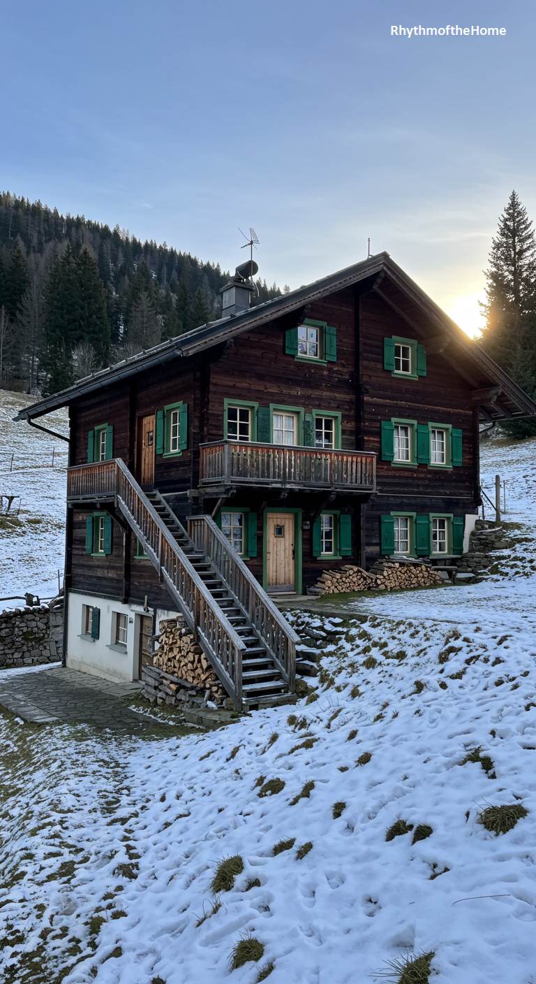 This traditional wooden mountain home is built into a snowy, sun-drenched hillside, showcasing a practical and charming design. The dark wood of the house, accented by cheerful green shutters, stands out against the white landscape. An external wooden staircase provides access to the upper level, a common feature in alpine farmhouses. Stacks of firewood are tucked neatly under the eaves, a testament to the necessities of mountain life. With the sun low in the sky and a forest rising up the hill behind it, this home feels peaceful, authentic, and deeply connected to its rural, alpine setting.
