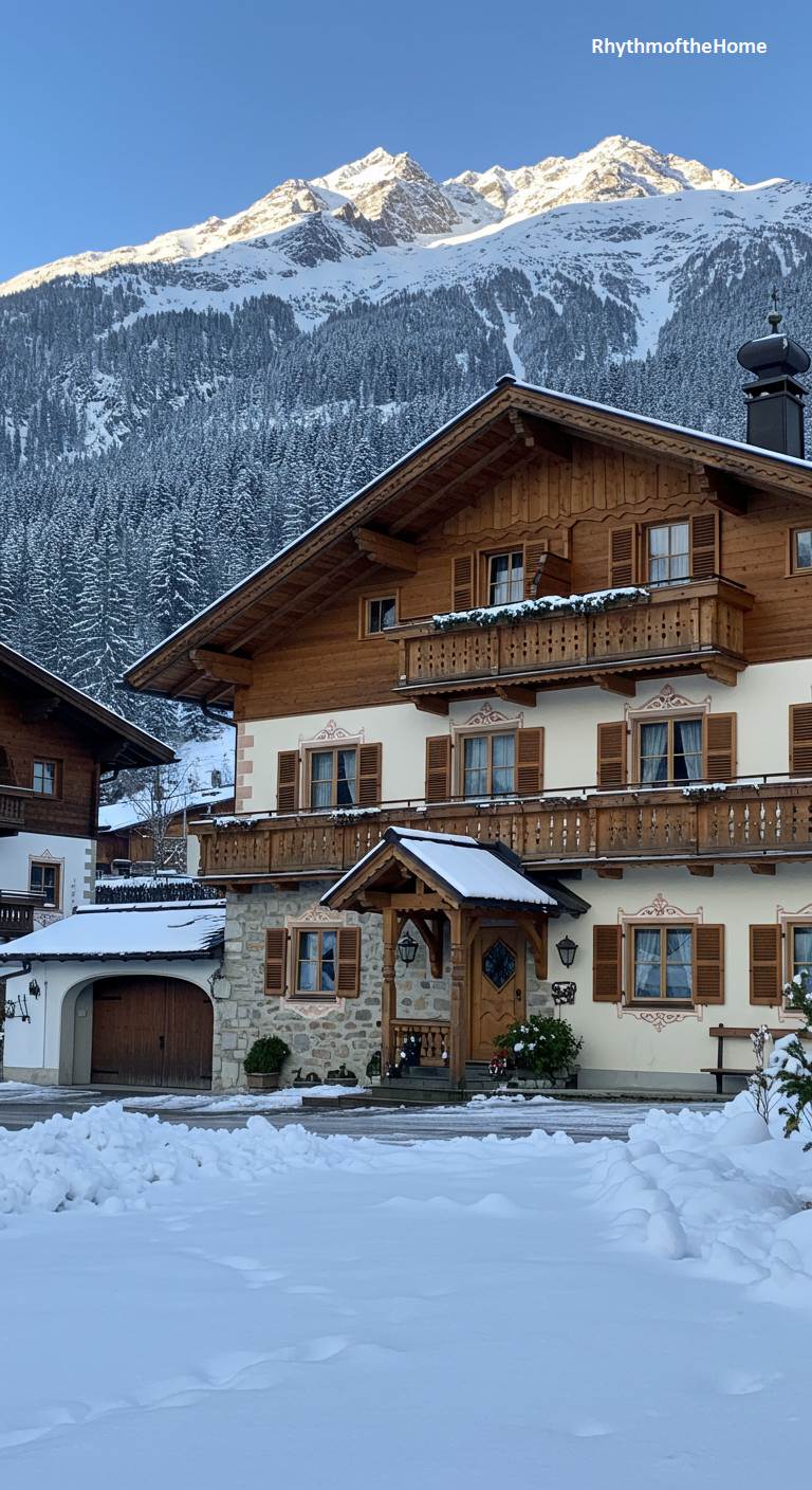 This beautiful mountain home is a centerpiece of a classic alpine village scene. Its lower level of stone and stucco gives way to an upper story of warm wood, featuring an ornate balcony and decorative paintings. The sharp, snow-covered peaks of a majestic mountain range rise dramatically behind the village, their summits catching the morning sun. The deep snow in the foreground and the traditional architecture create a picturesque, almost postcard-perfect image of life in a high-altitude European paradise. It’s a home that is part of a community, yet still surrounded by epic natural beauty.