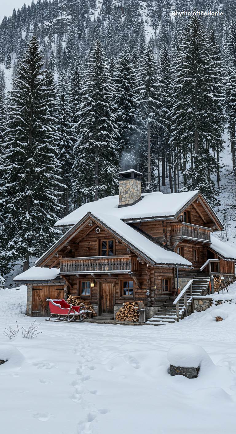 Nestled deep in a snowy forest of towering, snow-laden fir trees, this large log chalet is a dream of a winter escape. Its robust, traditional log construction and multiple balconies are characteristic of French alpine design. A thick blanket of untouched snow covers the roof and grounds, creating a serene and quiet atmosphere. A classic red wooden sleigh sits by the entrance, adding a touch of festive color and nostalgia to the scene. With smoke gently rising from its stone chimney, this home is a bastion of warmth and comfort in a breathtakingly beautiful and secluded winter wonderland.
