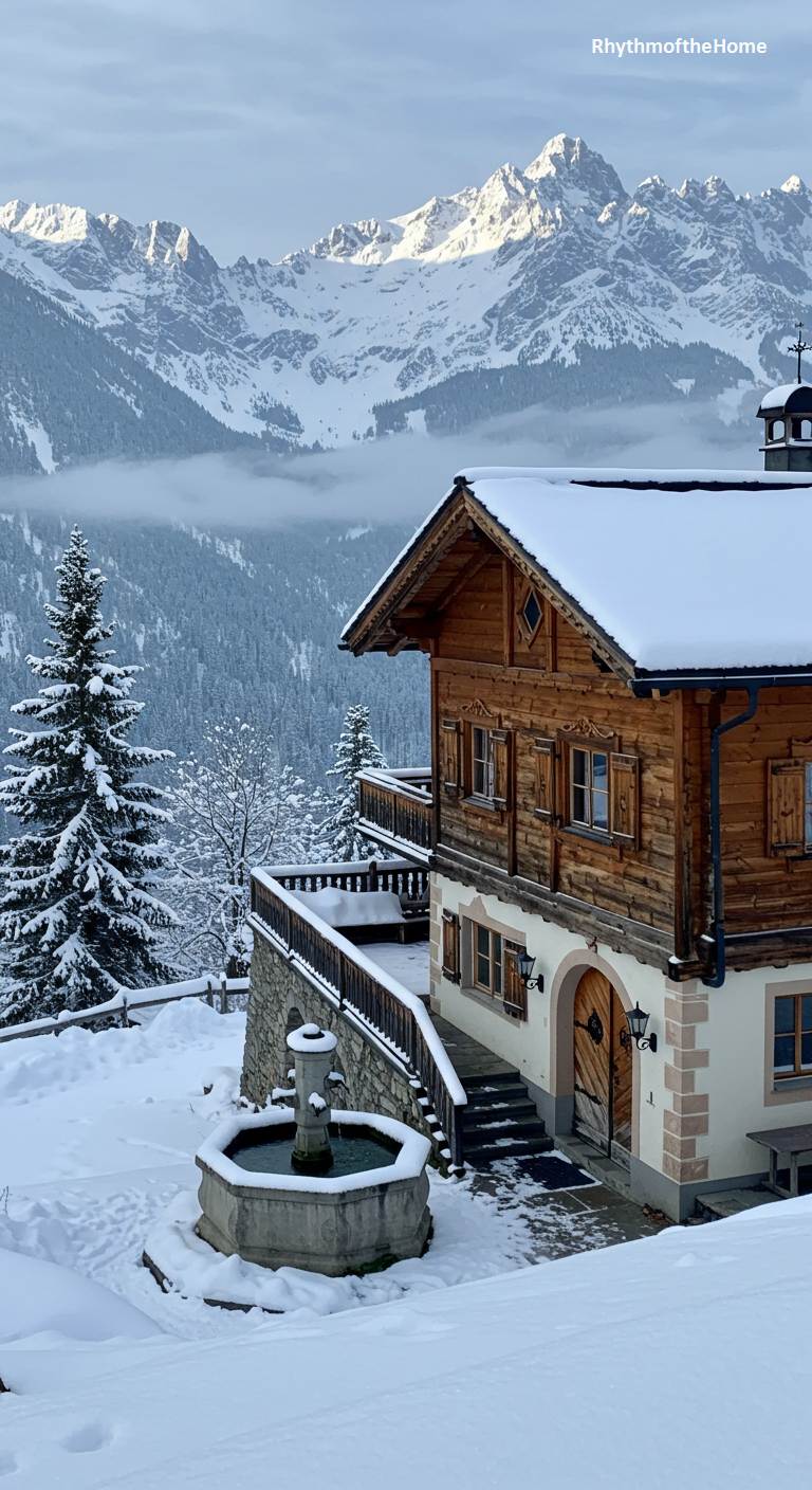 This charming alpine home offers a spectacular vantage point over a vast, wintery landscape. Situated on a snowy precipice, it overlooks a valley filled with low-lying clouds and a forest of snow-dusted trees. In the distance, a majestic range of sun-kissed peaks stretches across the horizon. The home itself, a blend of stucco and wood with traditional shutters, has a timeless appeal. A beautiful stone fountain in the foreground, though dormant in the winter, adds a touch of classical elegance to this incredible high-altitude setting. It’s a place of serene beauty and awe-inspiring views.