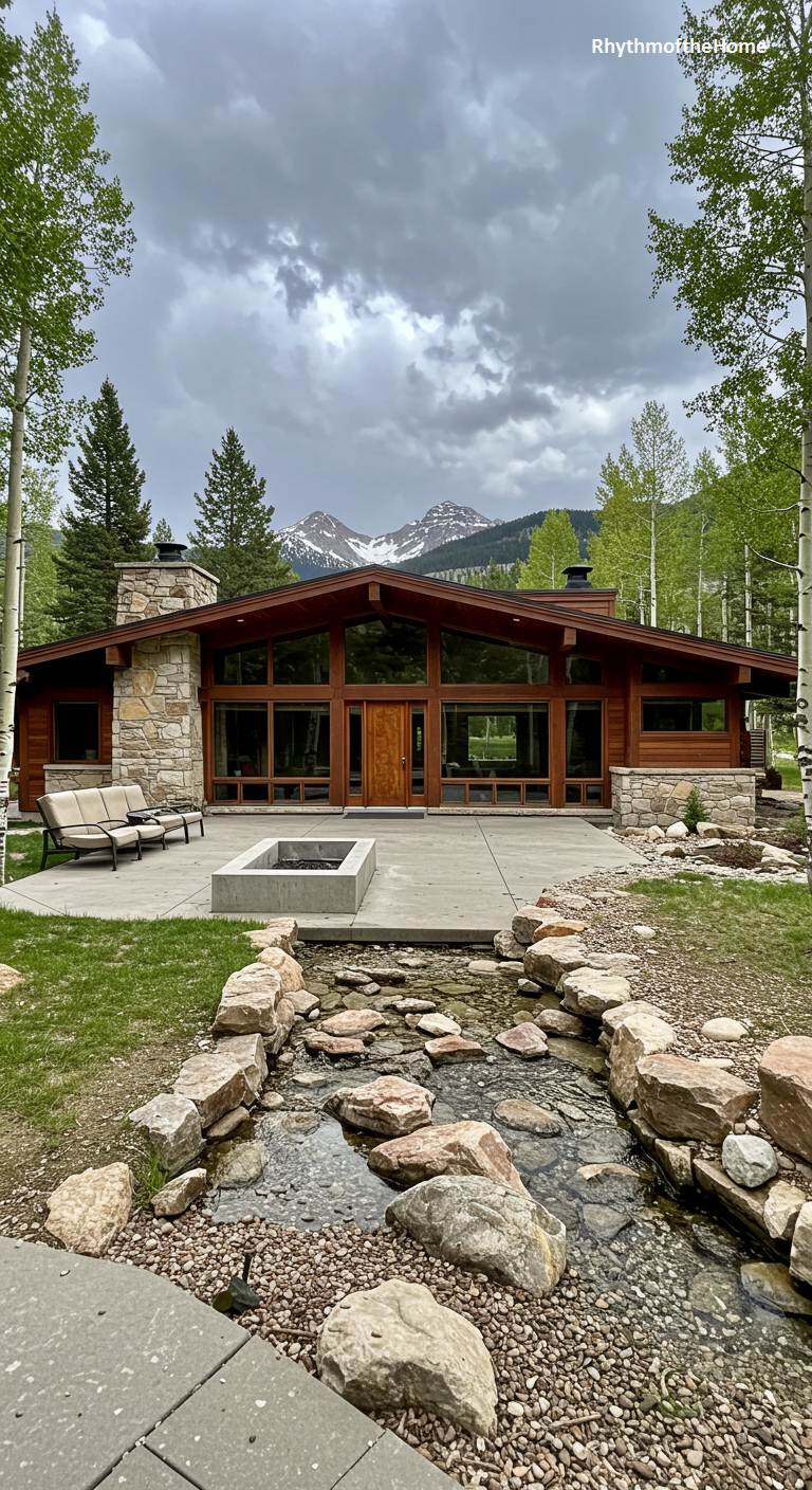 This sprawling, single-story mountain home exudes a cool, mid-century modern vibe, updated for contemporary comfort. Its low-slung roofline and extensive use of glass in the main facade work to erase the boundary between the stylish interior and the stunning natural setting. A sleek concrete patio features a minimalist fire pit, inviting gatherings under the vast, cloudy sky. A man-made stream, lined with smooth river rocks, meanders through the foreground, its gentle murmur adding to the sense of tranquility. Framed by the delicate, pale trunks of aspen trees and with a view of distant, snow-kissed peaks, this home is a serene and sophisticated oasis.