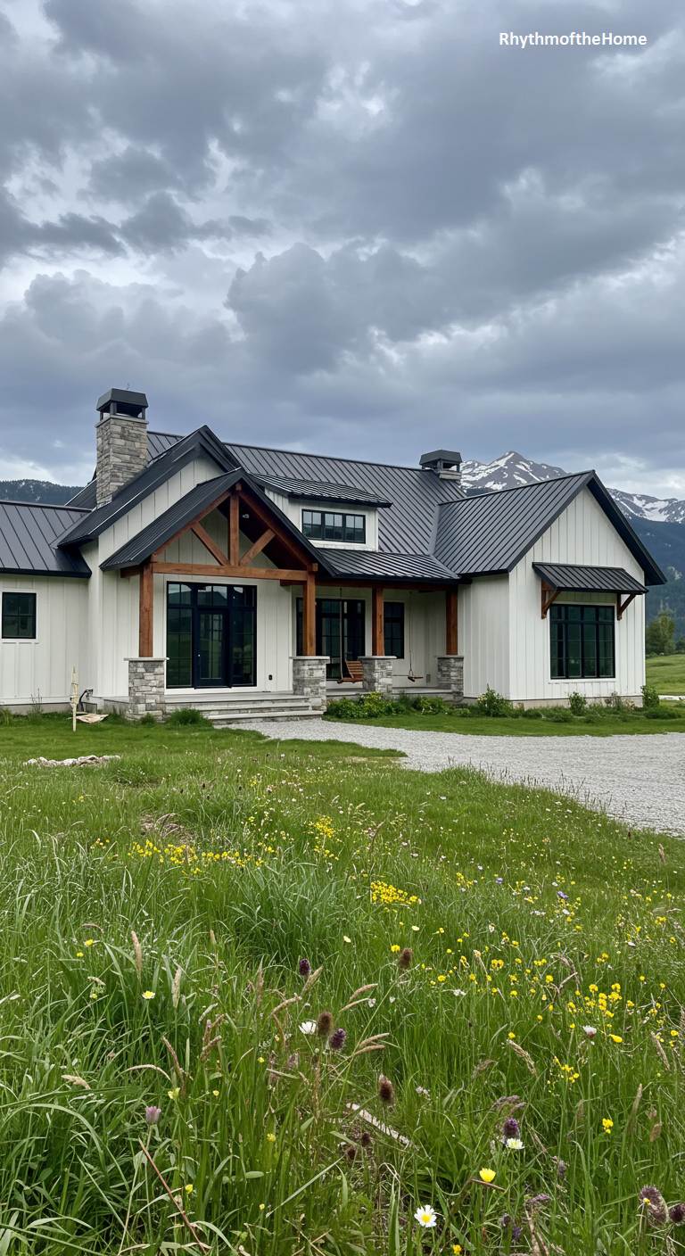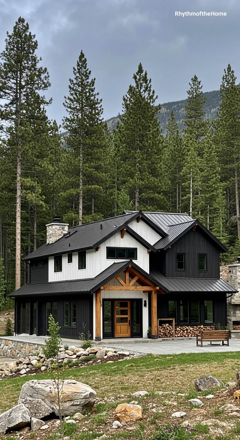 This modern mountain home makes a powerful architectural statement with its bold black and white color scheme. The main body of the house is clad in dramatic black siding, while a central gabled section in crisp white creates a stunning focal point. A natural wood timber-frame entryway adds a touch of organic warmth, beautifully bridging the two contrasting colors. The home is nestled amongst tall pines and a rugged, rocky landscape, its clean, contemporary lines standing in beautiful dialogue with the wildness of its surroundings. This is a sophisticated and visually arresting design.