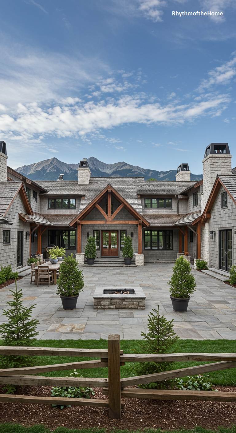 This stately mountain residence is designed with the grandeur of a private estate. The sprawling structure, with its grey shingle siding and prominent timber-frame gables, forms a large, formal courtyard paved with elegant flagstone. A central fire pit and symmetrically placed potted trees create a sense of refined order and an inviting space for large gatherings. A rustic split-rail fence in the foreground adds a touch of country charm, while the mountain range visible in the distance provides a suitably epic backdrop for this luxurious and impeccably designed home.