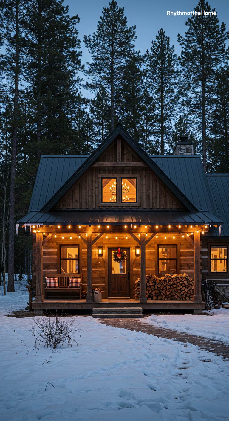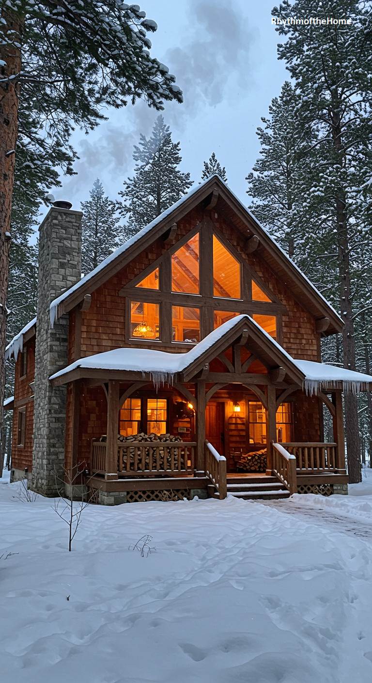 As evening falls on a snowy landscape, this cozy log cabin becomes the very picture of holiday warmth. A string of cheerful lights drapes along the front porch, casting a golden glow on the snow and the rich, dark logs of the cabin. A festive wreath hangs on the door, and warm light spills from the windows, revealing a glimpse of a chandelier inside. Firewood is stacked neatly on the porch, promising a long and cozy night by the fire. Framed by tall, dark pines, this home is a simple yet powerful image of comfort, joy, and festive spirit.