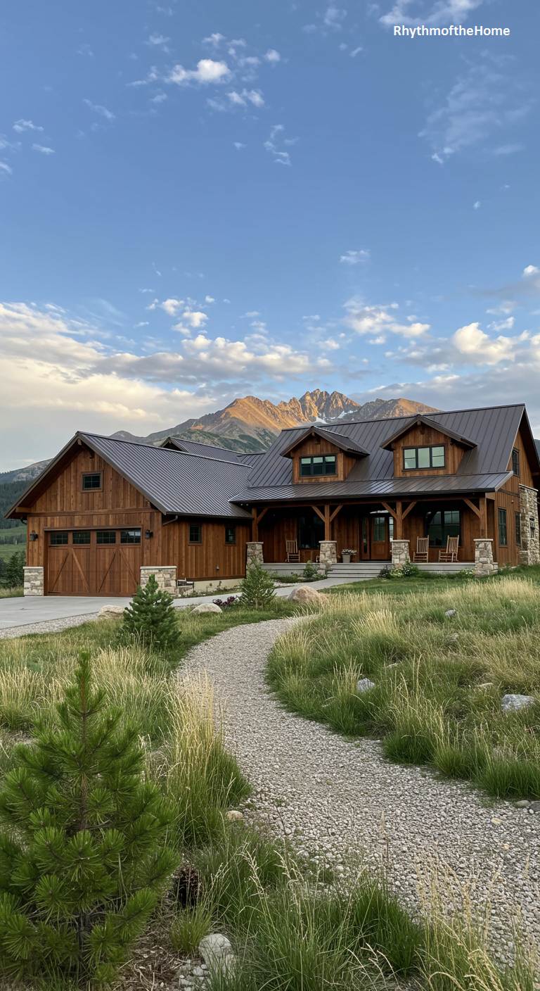 This expansive ranch-style home sits with quiet dignity in a vast, open landscape under a dramatic, cloudy sky. Its long, low profile, characterized by rich wood siding, multiple gables, and a prominent timber-frame entrance, speaks of comfort and unpretentious luxury. A winding gravel driveway approaches the house, passing by carefully placed boulders and young trees that are just beginning to establish themselves. This is a home designed for a family, with a sense of space, stability, and a deep connection to the land and the majestic mountain views.