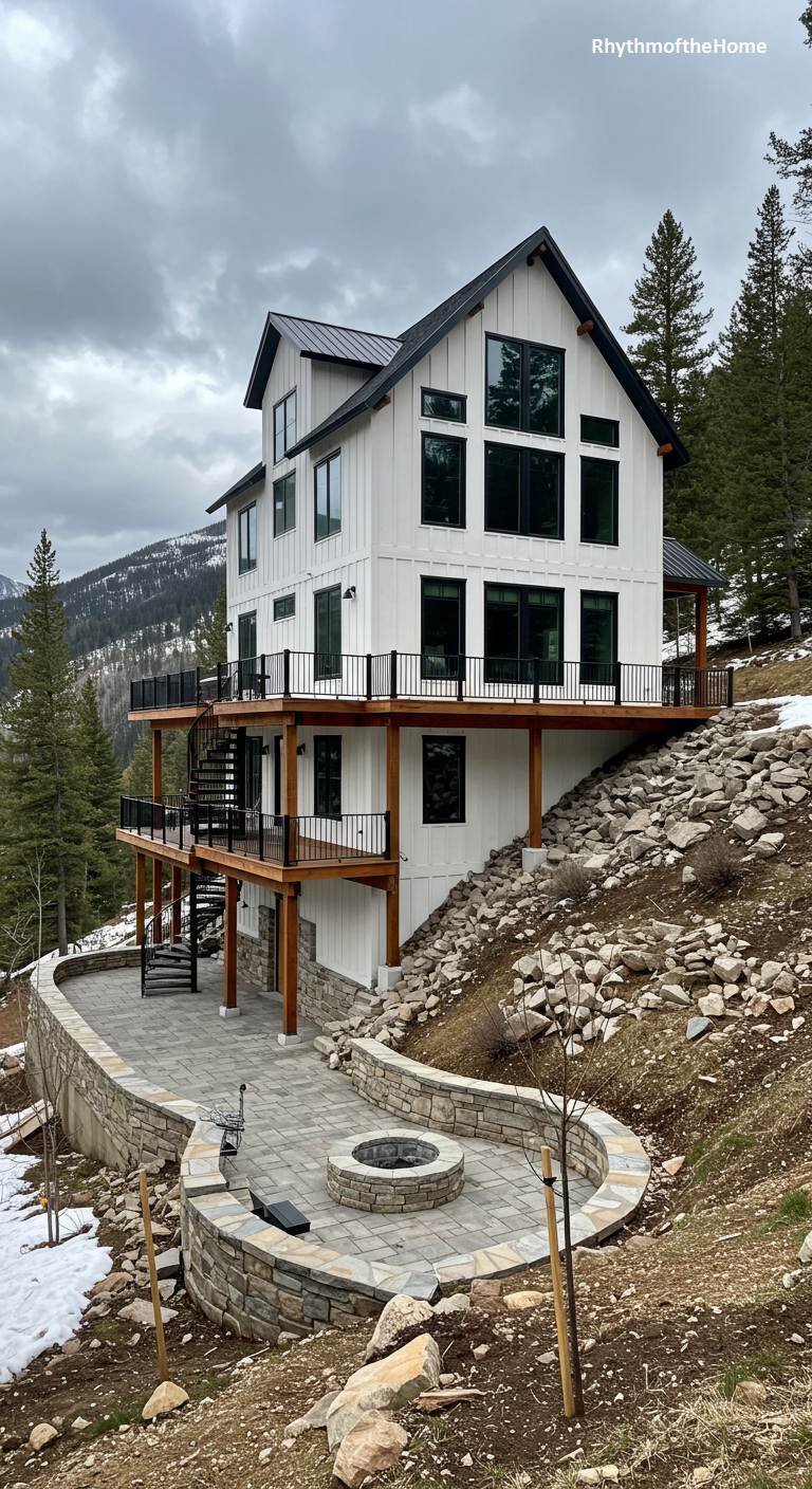 This striking modern home is dramatically built into a steep, rocky hillside, showcasing a bold, multi-level design. Its bright white siding creates a stunning contrast with the black window frames, railings, and the dark tones of the surrounding forest. A series of decks and a spiral staircase provide multiple points of access and outdoor living spaces with incredible views. The lower level features a curved stone retaining wall and a patio with a fire pit, creating a perfect spot to gather after a day on the slopes. This is a statement home, combining architectural daring with a challenging, beautiful setting.