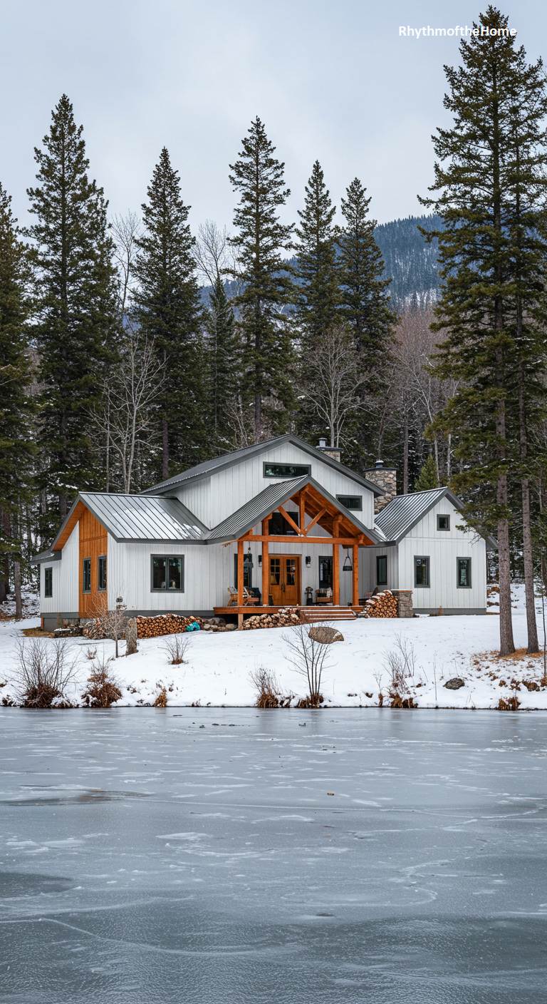 Situated on the edge of a frozen lake, this home blends the rustic form of a barn with a clean, modern aesthetic. The main structure is finished in bright white vertical siding, while a wing to the side features natural wood, creating a pleasing material contrast. A timber-frame porch offers a sheltered entry and a place to stack firewood. Large windows look out over the icy expanse, connecting the warm interior with the stark beauty of the winter landscape. Surrounded by snow and tall trees, this home is a fresh, stylish, and peaceful lakeside retreat.