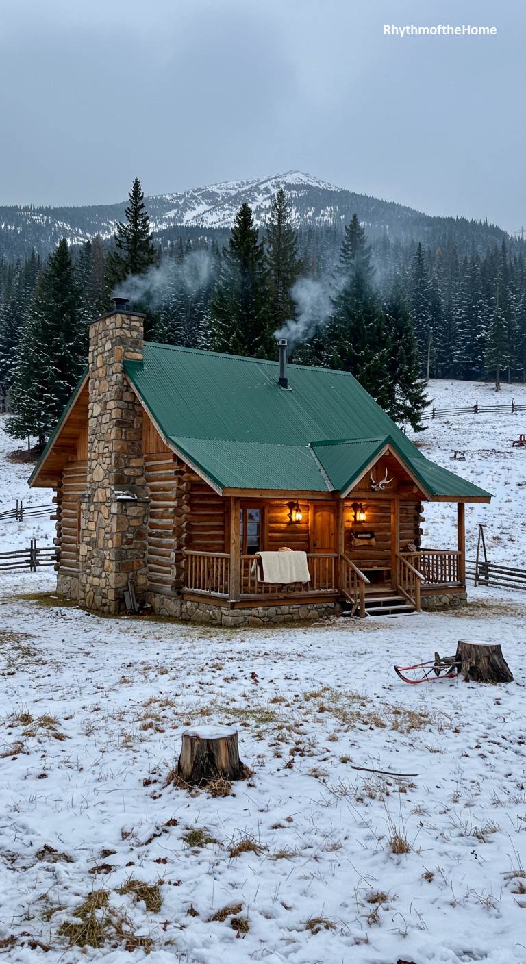 The quintessential image of winter comfort, this compact log cabin is a picture of serene self-sufficiency. Its sturdy, round-log construction and a formidable stone chimney promise enduring warmth against the cold. A gentle plume of smoke drifts from the chimney, a sure sign of a cozy fire roaring within. The vibrant green metal roof provides a cheerful splash of color against the white, snow-dusted landscape and the deep green of the surrounding pines. A simple wooden porch, holding a softly draped blanket, offers a place to breathe in the crisp winter air. It’s a humble, honest, and deeply inviting mountain home.