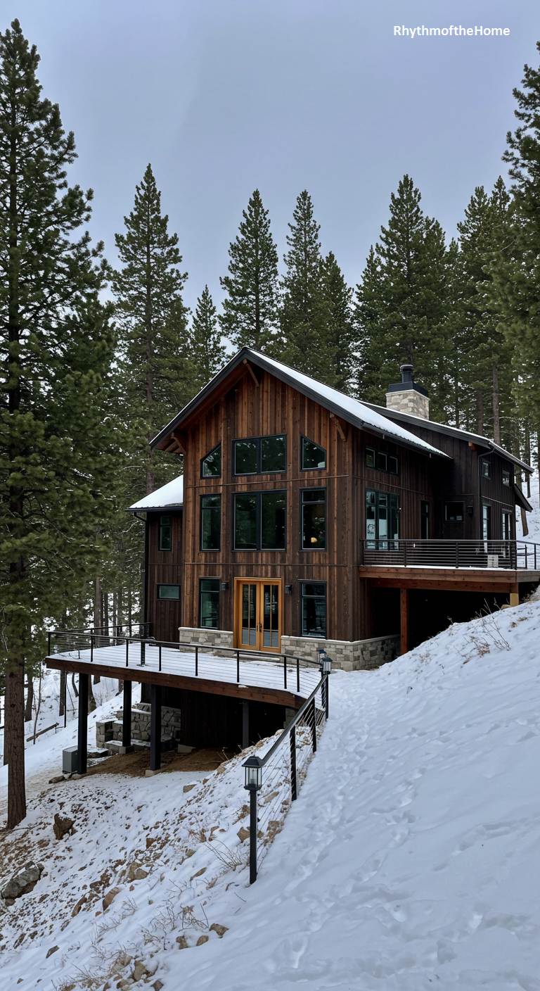 This contemporary mountain home is masterfully designed to cascade down a snowy, pine-covered slope. Its dark wood siding allows it to recede into the shadows of the forest, while large, multi-level windows capture the natural light and woodland views. An expansive deck on stilts projects out from the main living area, creating a dramatic overlook and an ideal space for outdoor entertaining. A snow-covered path winds down the hill, suggesting a connection to further adventures in the woods. This is a dynamic and sophisticated home that lives in perfect harmony with its challenging, beautiful terrain.