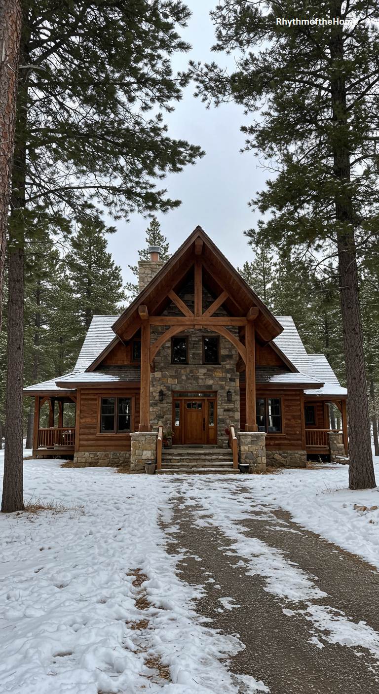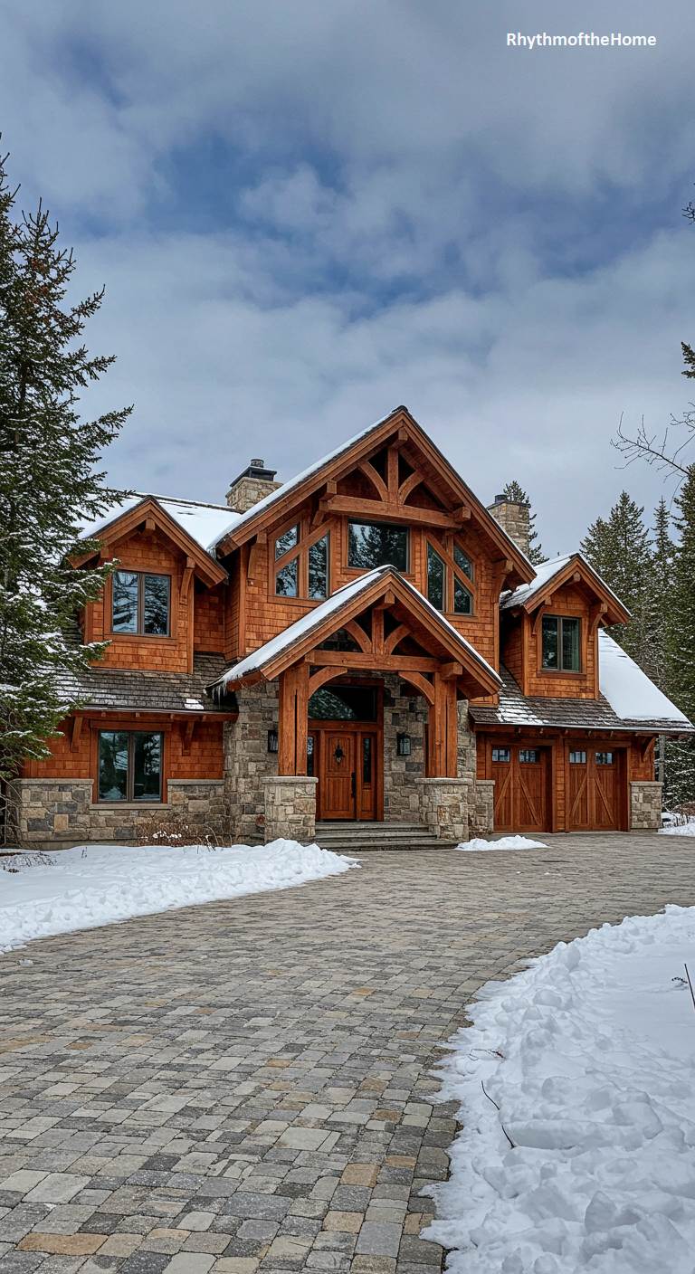 This stunning timber-frame home is the epitome of a luxury winter escape. A blanket of fresh snow softens the lines of the paved driveway and clings to the branches of the surrounding pines. The home’s architecture is a symphony of natural materials, with warm wood shingles, massive timber framing over the entrance, and a sturdy stone base. The design is both grand and intricate, with multiple gables and dormers creating a visually captivating structure. It radiates a feeling of immense comfort, quality, and warmth, a perfect high-end sanctuary from the winter chill.