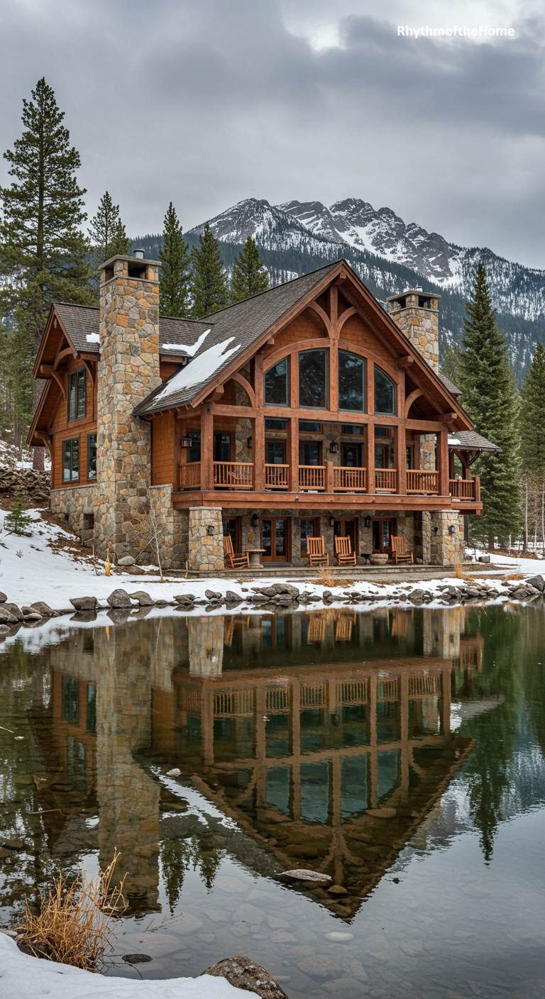 This beautiful timber-frame home sits serenely on the shore of a calm, reflective lake. The entire structure, with its warm wood, robust stone chimneys, and large, inviting windows, is perfectly mirrored in the still water, creating a stunningly symmetrical and peaceful image. Patches of snow on the ground and the distant, snow-covered peak signal a crisp, early spring or late autumn day. The combination of the grand, yet rustic architecture and the tranquil water creates a scene of profound beauty and quiet contemplation, a perfect harmony of man-made structure and natural wonder.