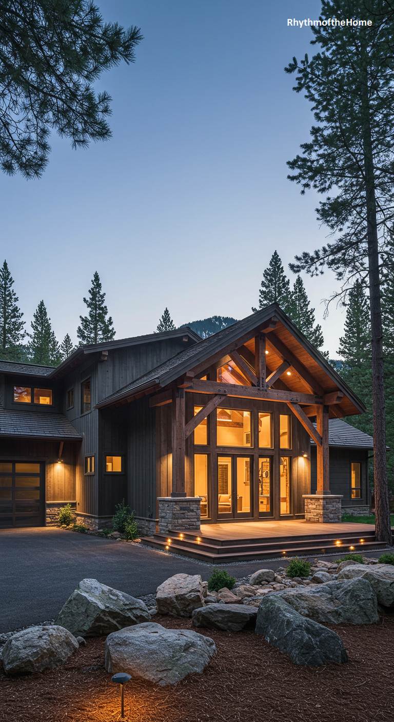 This modern home makes a striking first impression, especially as dusk settles. The architectural focus is a magnificent, illuminated entryway with a high, gabled roof supported by massive timber beams. This glowing portal provides a warm and dramatic welcome. The rest of the house features dark, understated siding, allowing the entrance to be the star. The landscaping is natural and rugged, with large boulders and a gravel driveway that blend seamlessly with the surrounding pine forest. This is a home that balances modern design with a deep respect for its rustic, woodland environment.