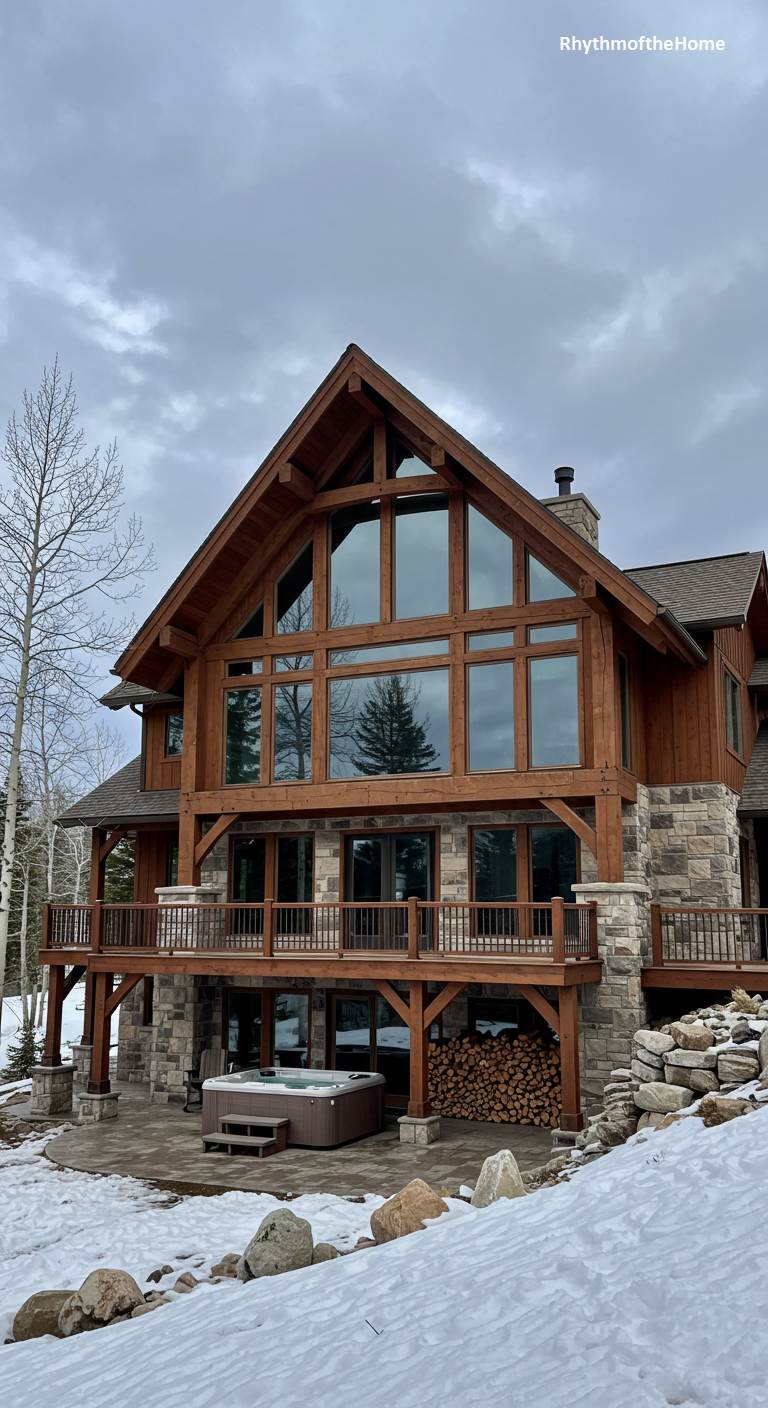 This impressive timber-frame home is perfectly designed for a luxurious mountain lifestyle. Its rear facade opens up to a stunning view, with a large, inviting deck and a lower stone patio. The centerpiece is a steaming jacuzzi, ideally positioned for a warm soak while gazing out at the snowy landscape and aspen groves. The home’s architecture, with its massive A-frame window wall and sturdy stone base, is both grand and welcoming. A neat stack of firewood under the deck adds a rustic, practical touch to this ultimate slopeside retreat.