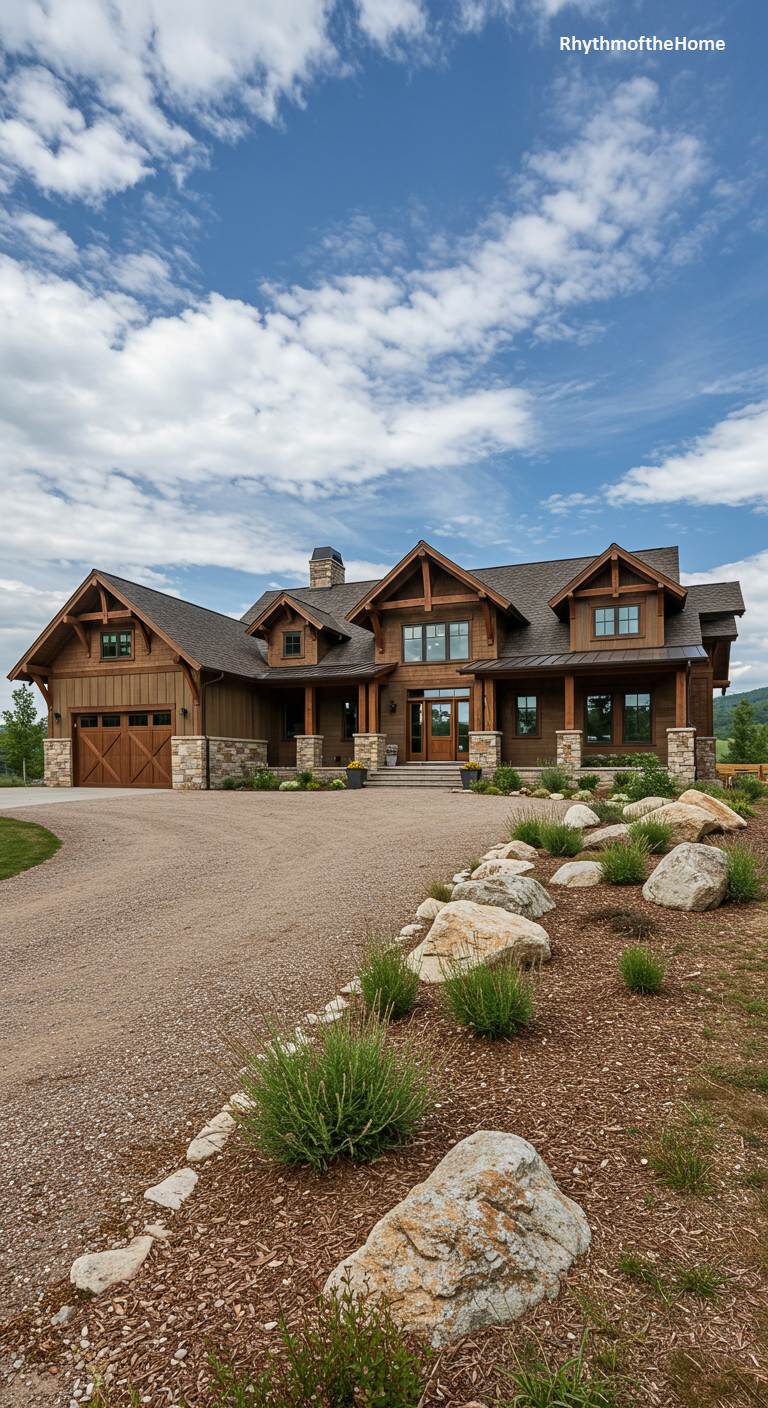 Under a vast, blue sky dotted with fluffy white clouds, this impressive Craftsman-style mountain home commands its landscape with understated elegance. The combination of warm wood siding, stone pillar bases, and intricate timber trusses in the gables showcases exceptional architectural detail. A long, winding gravel driveway curves past thoughtfully placed boulders and native shrubs, leading to a home that feels both grand and welcoming. The design prioritizes a connection to the outdoors, with large windows and a covered porch suggesting a life lived in harmony with the surrounding open spaces and distant hills, a perfect blend of luxury and natural simplicity.