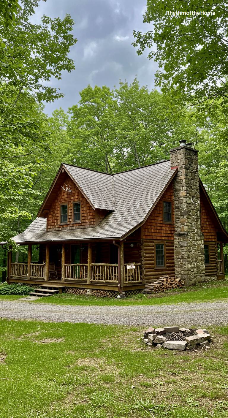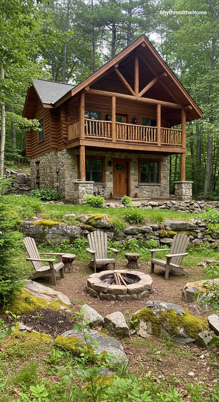 This charming two-story log cabin is designed for creating memories around a fire. The lower level, built with a handsome stone foundation, provides a solid base for the log structure above. A second-story balcony offers a private, elevated view of the woods. The true heart of the scene is the stone-lined fire pit in the foreground, surrounded by four classic Adirondack chairs. It’s an open invitation for conversation, laughter, and enjoying the simple pleasure of a crackling fire in a beautiful, natural setting. This home is a perfect blend of cozy living and outdoor enjoyment.